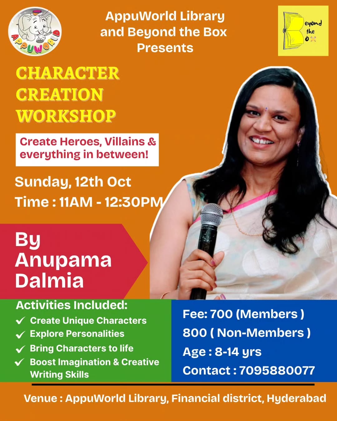 ✨ Character Creation Workshop Create Heroes, Villains & Everything in Between! 📖 Build a strong base for storytelling, essays & creative projects. 🗓 Sunday, 12th October ⏰ 11:30 AM – 1:00 PM Ages: 8–14 yr 📍 AppuWorld Library, Financial District 🌟 Benefits: ✨ Craft unique, memorable characters ✨ Explore traits & motivations ✨ Play storytelling games & prompts ✨ Boost creativity & writing skills ✨ FREE Character Creation Toolkit 🎁 📢 Limited seats! DM or WhatsApp to register now! #AppuWorldLibrary #CharacterCreation #CreativeWriting #KidsWorkshop #HyderabadMoms #YoungWriters #StorytellingMagic