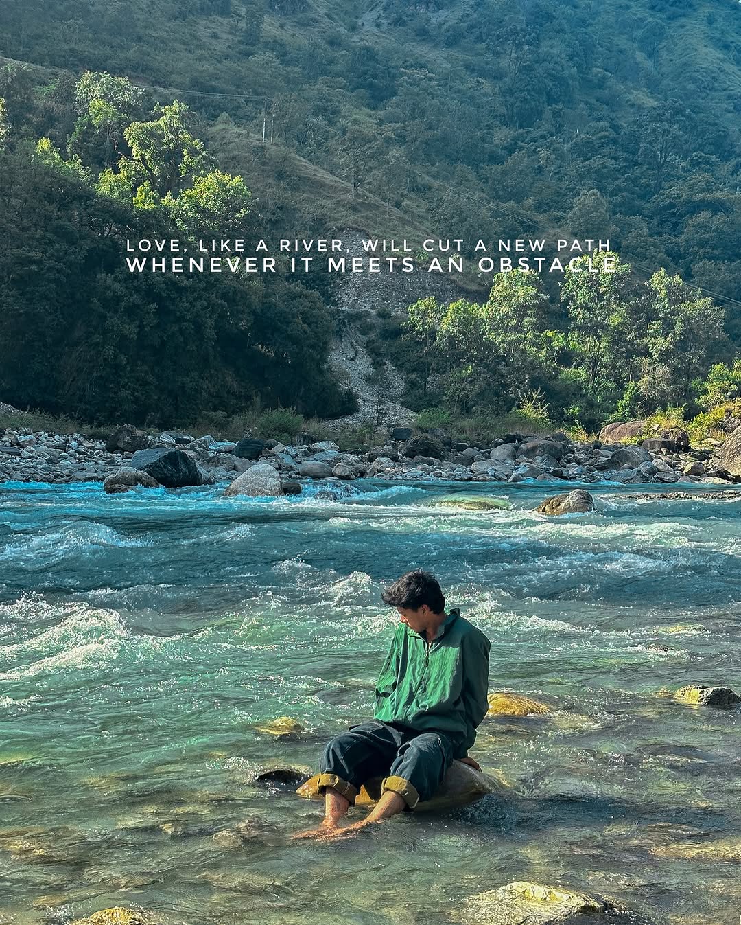 LOVE, LIKE A RIVER, WILL CUT A NEW PATH whenever it meets an obstacle🫧 #river #mountains #uttarakhand #explorer #happyplace