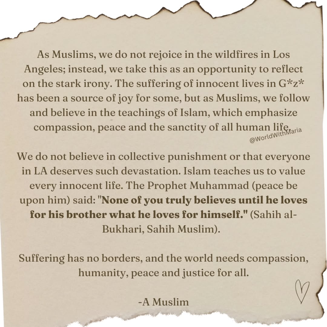 As Muslims, we do not rejoice in the wildfires in Los Angeles; instead, we take this as an opportunity to reflect on the stark irony. The suffering of innocent lives in G*z* has been a source of joy for some, but as Muslims, we follow and believe in the teachings of Islam, which emphasize compassion, peace and the sanctity of all human life. We do not believe in collective punishment or that everyone in LA deserves such devastation. Islam teaches us to value every innocent life. The Prophet Muhammad (peace be upon him) said: "None of you truly believes until he loves for his brother what he loves for himself." (Sahih al-Bukhari, Sahih Muslim). Suffering has no borders, and the world needs compassion, humanity, peace, and justice for all. -A Muslim #worldwithmaria #clumsyindiangirl #californiafires #losangelesfire #FireInCalifornia ##dailyreminder #muslimsoftheworld