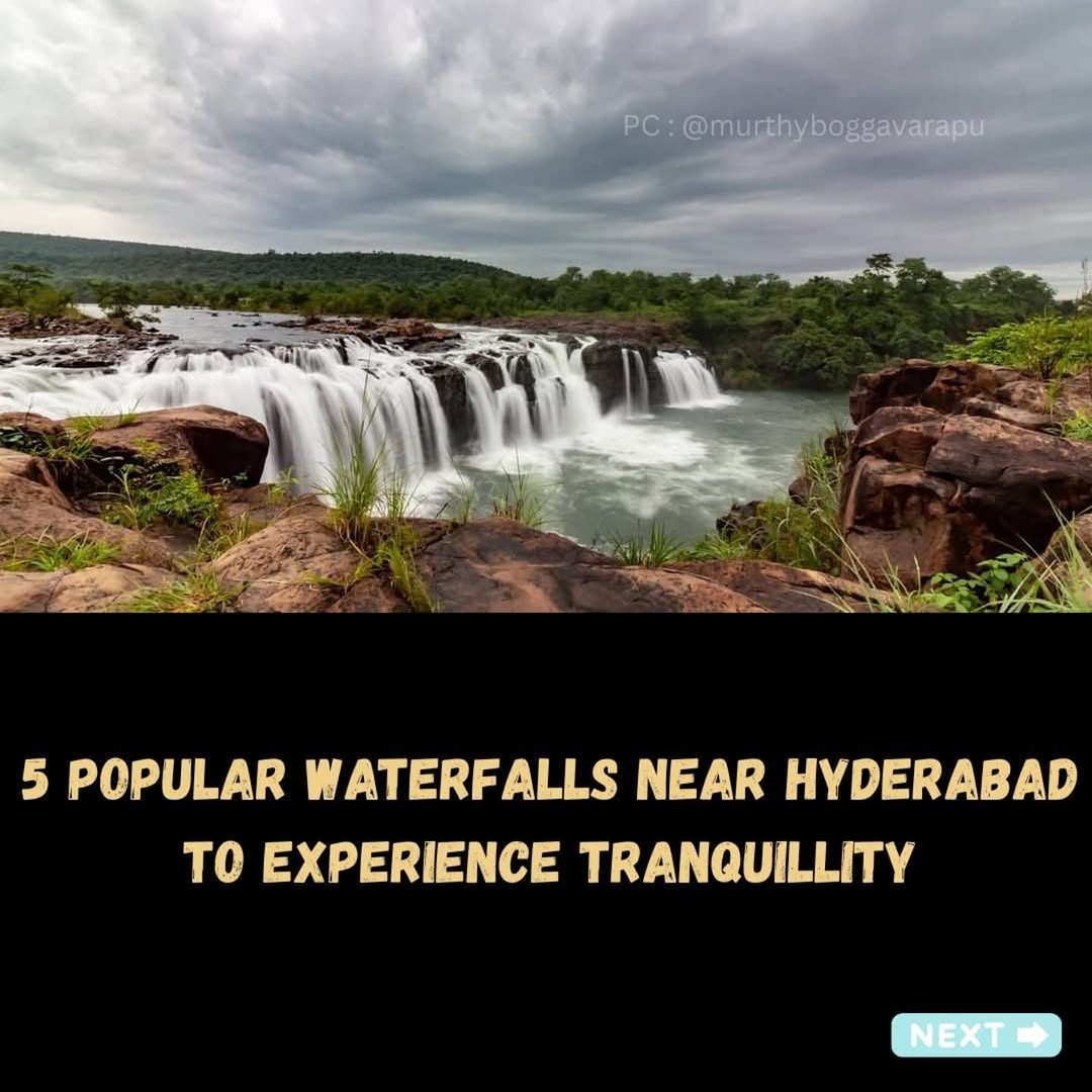 Five popular waterfalls near Hyderabad. Which one's your favourite? Which other waterfalls near Hyderabad would you suggest people as a must visit? . [Hyderabad, Hyderabadlive, Telangana, Waterfalls, Falls, Monsoon, Winter, Nature, Instagram, Explore, Viral, Share, Algorithm, Fun, Getaway, Weekend]
