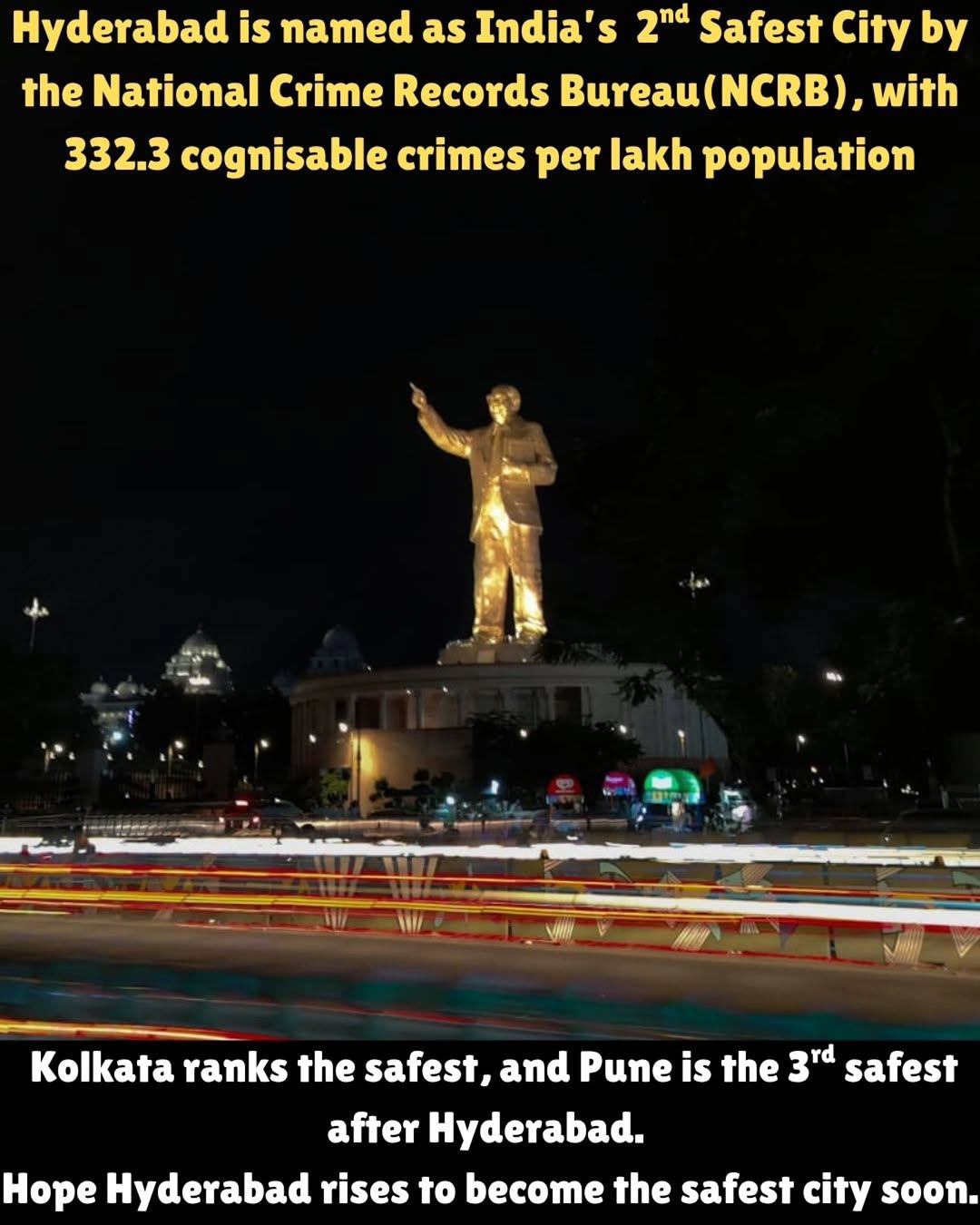 Data was recorded on 19 metropolitan cities with the measure of cognisable crimes in 2023. The top 10 safest cities(rank wise) : Kolkata, Hyderabad, Pune, Mumbai, Coimbatore, Chennai, Kanpur, Ghaziabad, Bengaluru, Ahmedabad Top 10 unsafe cities (rank wise) : Kochi(Kerala), Delhi, Surat, Jaipur, Patna, Indore, Lucknow, Nagpur, Kozhikode, Ahmedabad Source: The Indian Express Hope Hyderabad tops the list and rises as the Safest City in India soon. . Follow us @hyderabadlive for more content and regular updates from Hyderabad. . [Hyderabad, Hyderabadlive, Telangana, IT City, Safety, Hitech, Hitech City, Infrastructure, Devlopement, Human, Love, Metro, Metropolitan, News, Explore, Viral, Share, India]