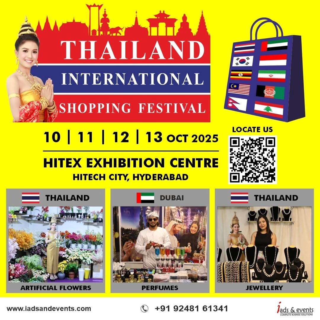 THAILAND INTERNATIONAL SHOPPING FESTIVAL & FURNITURE FAIR 🛋🏰 🎉 This Festive Season at HITEX, Hyderabad 🎉 ✨ Exclusive Products from Around the World ✨ 🌸 Thailand – Flowers, Kids Accessories, Home Décor, Women’s Accessories, Pearl Jewellery, Oils & Balms, Clothing, Artificial Jewellery, Handbags 👜 Singapore – Handbags & Women’s Accessories 💍 Korea – Women’s Accessories 🍫 Dubai – Baklava, Perfumes & Chocolates 🍬 Iran – Jewellery & Chocolates 🥜 Afghanistan – Dry Fruits 🇲🇦Morocco - Chandeliers ✨ Elevate Your Home with Stylish Furniture ✨ 🛋️ Leather | Classic | Ethnic | Vintage | Contemporary | Sheesham 🌿 Malaysia – Outdoor Furniture 📅 Date: 10th – 13th October 2025 🕙 Timings: 10:00 AM – 8:30 PM 📍 Venue: HITEX Exhibition Centre, Hitech City, Hyderabad 📞 For Enquiries: +91 92481 61341 . [Hyderabad, Hyderabadlive, Telangana, Fair, Sale, Events, Explore, Carousel, Post, Instagram, Hitech City, Exhibition, Furniture, Accessories, Jewellery, Outdoor, Bags, Dry Fruits, Exclusive, Products, Shopping, International Festival, Style, Share, Viral]