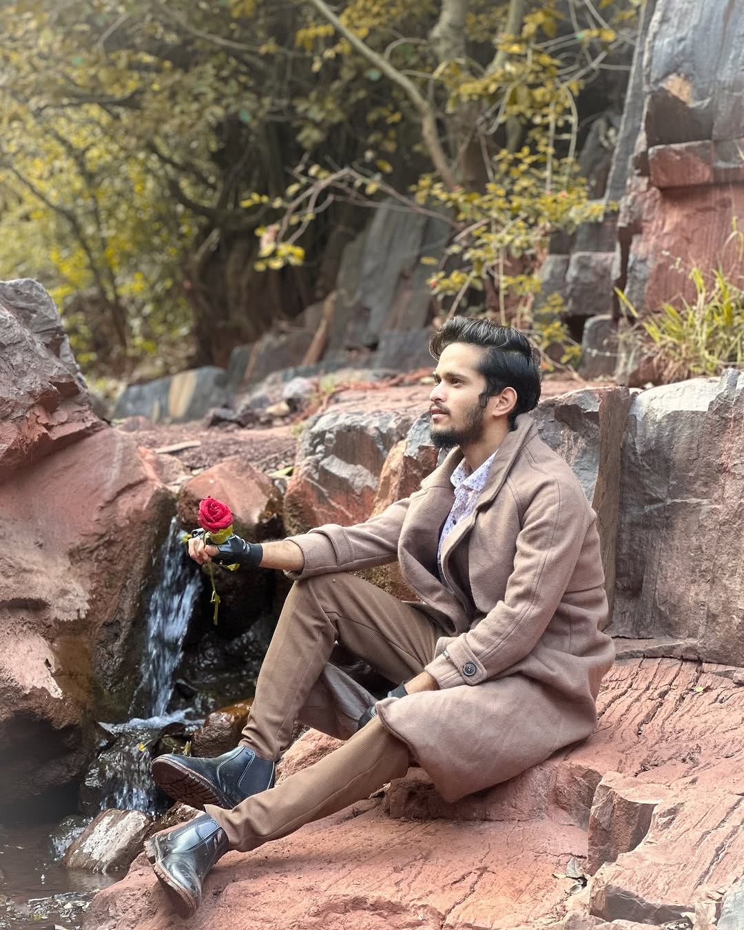 “Lost in the whispers of nature, holding onto a rose and a thousand unspoken thoughts. 🌹🍂 #NatureSerenade” . . . . #naturevibe #telugu #RoseRomance #StylishLook #FallFashion #InstaMood #PortraitPhotography #TravelDiaries #ScenicBeauty #MenWithStyle #AestheticVibes #OutdoorShoot #FashionGoals #PeacefulMoments #modellife