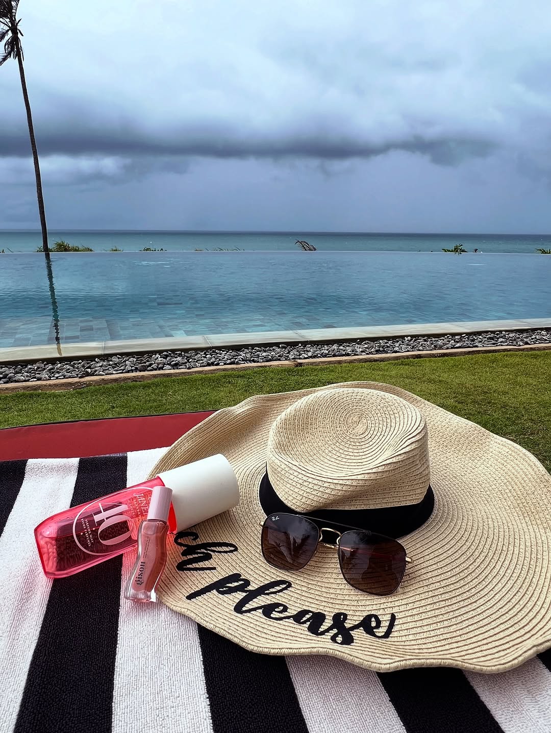 Beach essentials 🏖️ . @soldejaneiro mist in 40 Lip oil: @gisou in shade plum glaze (My absolute favourite at the moment) Floopy hat @lifesabeach.in #beach #essentials #srilanka #beauty #makeup #fyp