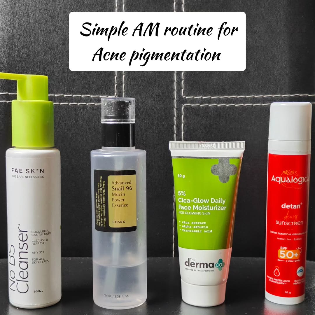 Simple AM routine for Acne pigmentation 🔆💖 🌸Gentle cleanser: Choose a gentle non stripping cleanser in your morning routine. @faebeautyofficial No BS cleanser is a great option that you can try ! 🌸Hydration is the key ! Do not compromise on Skin's hydration even if you have oily skin. Hydrated skin heals much faster than dehydrated skin. @cosrx snail mucin essence is a great option to hydrate and heal your skin. 🌸 Moisturizer with brightening ingredients: Choosing a Moisturizer with brightening ingredients will cut down steps from your skincare making it easy in the mornings. @thedermacoindia cica glow moisturizer is my most favourite one that definitely helps to lighten your pigmentation. I have seen a great difference in my pigmentation. I will definitely keep buying this!! 🌸Sun protection is a must no matter what your skin type, climate is. There should never be an AM routine without a SPF ever! @aqualogica.in detan sunscreen has become my fav lately❤️ It blends literally in seconds leaving the skin correctly dewy. This will suit all skin types. 🚨Your skincare routine is incomplete without an SPF. 10 other steps without SPF is a waste!! So NEVER SKIP YOUR SPF ! #skincareroutine #skincare #morningroutine #acne #skinpigmentation #acnemarks #skinbrightening #tanremoval #tan #morningskincare