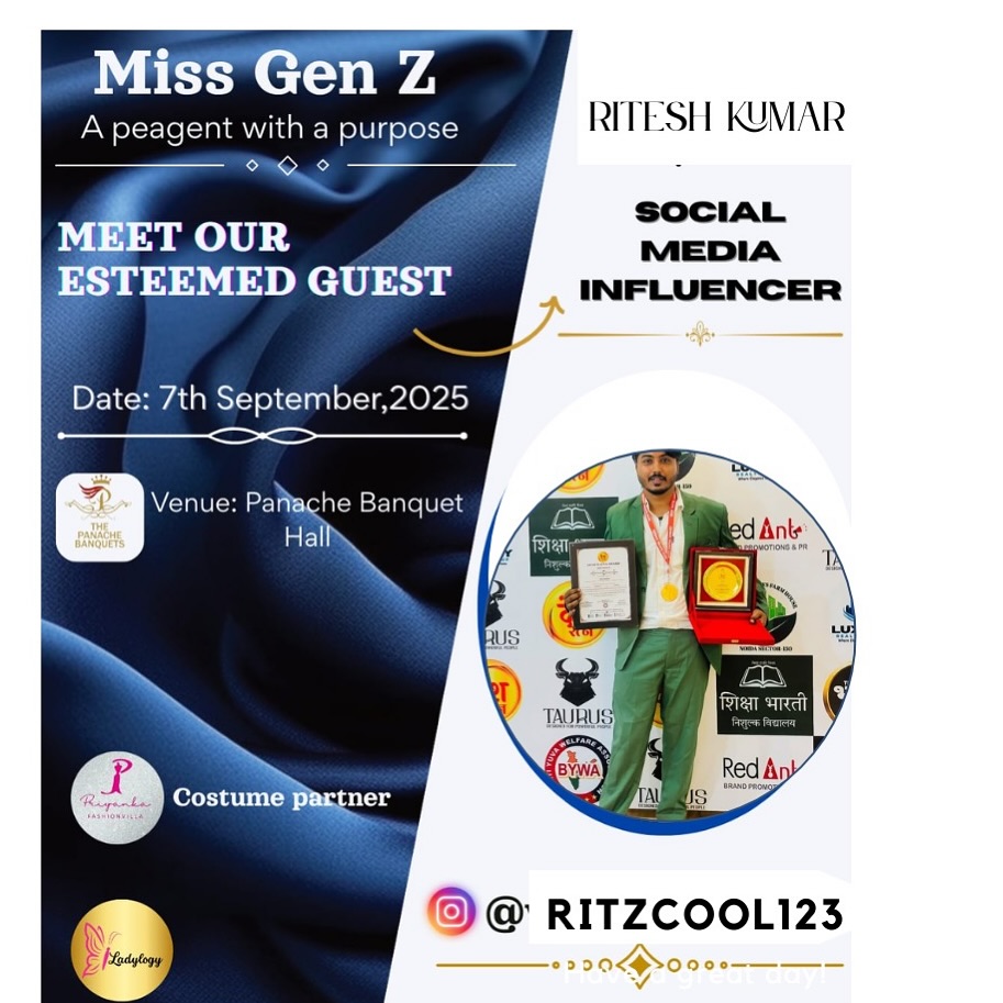 This post was published on 06th August, 2025 by Ritesh on his Instagram handle "@ritzcool123_official_ (Ritesh kumar influencer)". Ritesh has total 111.3K followers on Instagram and has a total of 1.5K post.This post has received 3.1K Likes which are greater than the average likes that Ritesh gets. Ritesh receives an average engagement rate of 1.59% per post on Instagram. This post has received 52 comments which are greater than the average comments that Ritesh gets. Overall the engagement rate for this post was lower than the average for the profile. #beautypageantindia #pageants has been used frequently in this Post.