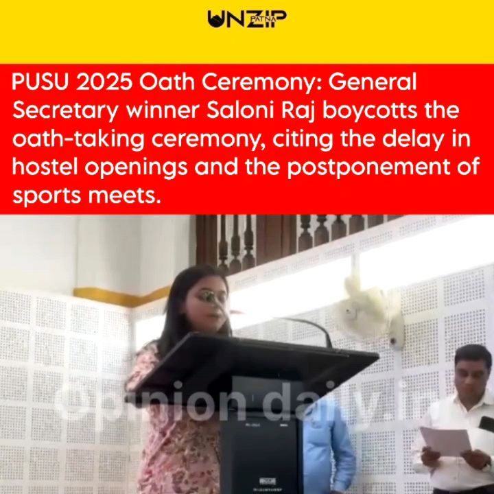The PUSU 2025 oath-taking ceremony turned into a site of protest today as General Secretary winner Saloni Raj boycotted the event, stating that the Vice Chancellor has not kept his word on any matter. She pointed out that the hostels should have been opened by now and that no proper sporting events have taken place in the past few years. #patnauniversity Follow us for more updates @unzip_patna #unzippatna #biharnews #news #biharnewstoday #patna #biharnewsonline #biharsehai #studentunion #biharnews #patnauniversity #pu #pusu #patnauniversityelection #bncollege #pusu2025 #patnawomenscollege #abvp #teamosama #nsui