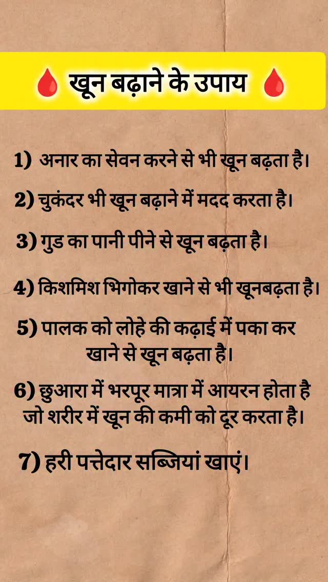 ♦️शरीर में खून की कमी (एनीमिया)🌿 को दूर करने के लिए आपको आयरन, फोलिक एसिड, विटामिन B12 और विटामिन C से भरपूर आहार लेना चाहिए। नीचे कुछ घरेलू और आहार संबंधी उपाय दिए गए हैं: 1. आयरन से भरपूर खाद्य पदार्थ हरी पत्तेदार सब्ज़ियाँ (पालक, मेथी, सरसों) चुकंदर अनार सेब किशमिश, खजूर गुड़ मसूर, चना और राजमा जैसे दालें 2. फोलिक एसिड और विटामिन B12 के स्रोत अंडा (यदि आप खाते हैं) दूध और पनीर मूंगफली अंकुरित अनाज केला 3. विटामिन C का सेवन करें (आयरन के अवशोषण में मदद करता है) आंवला नींबू पानी संतरा टमाटर अमरूद 4. खास घरेलू नुस्खे चुकंदर का रस + अनार का रस: सुबह खाली पेट लें। गुड़ और तिल: गुड़ के साथ तिल खाने से आयरन बढ़ता है। आंवला शहद के साथ: रोज सुबह 1 चम्मच आंवला पाउडर में शहद मिलाकर लें। Save & share This Reel ❤️ Follow Our page for more Tips ✨ #ankitasinghkuntal #anemia #haemoglobin #health #healthylife #healthtips #ayurveda #naturaltips #viralreels #reels #explorepage #exploremore #instadaily #naturaltips