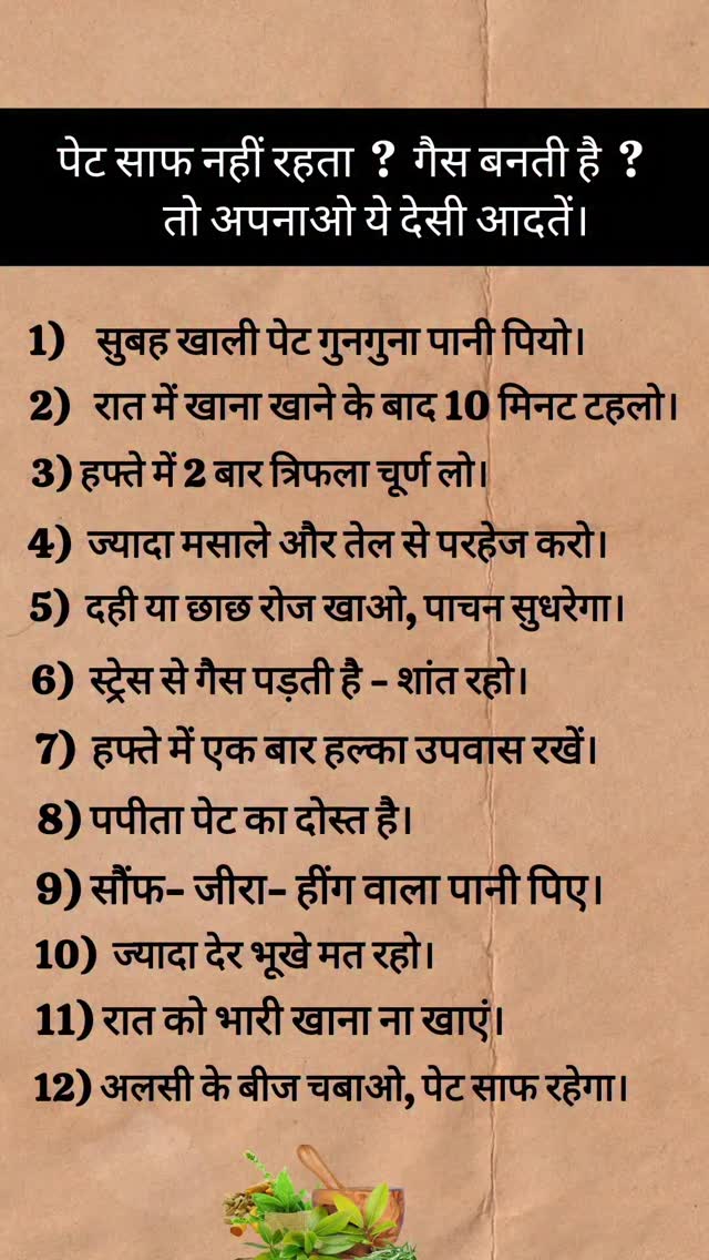 ♦️अगर पेट साफ नहीं रहता और गैस की समस्या रहती है, तो नीचे कुछ असरदार देसी उपाय दिए गए हैं जो आपको राहत दे सकते हैं: 🌿1. गुनगुना पानी + नींबू + शहद सुबह खाली पेट एक गिलास गुनगुने पानी में आधा नींबू और एक चम्मच शहद मिलाकर पिएं। इससे पाचन ठीक रहता है और कब्ज में राहत मिलती है। 🌿2. त्रिफला चूर्ण रात को सोने से पहले एक चम्मच त्रिफला चूर्ण गुनगुने पानी के साथ लें। यह पेट को साफ करता है और गैस बनने से रोकता है। 🌿3. हींग का सेवन चुटकीभर हींग को गुनगुने पानी में मिलाकर पिएं या हींग को पानी में घोलकर पेट पर लेप करें। गैस तुरंत निकल जाती है। 🌿4. जीरा-सौंफ-अजवाइन मिश्रण बराबर मात्रा में जीरा, सौंफ और अजवाइन को भूनकर पीस लें। रोज़ खाने के बाद आधा चम्मच इस चूर्ण को गुनगुने पानी के साथ लें। 🌿5. पपीता या इसबगोल पपीता खाने से पाचन सुधरता है। 1-2 चम्मच इसबगोल रात को दूध या गुनगुने पानी के साथ लें। 🌿6. ध्यान दें खाने की आदतों पर: तली-भुनी चीज़ें और अधिक मसालेदार खाना कम करें। खाना चबा-चबाकर खाएं और जल्दी-जल्दी न खाएं। रोज़ाना कम से कम 20–30 मिनट टहलें। अगर ये उपाय करने के बाद भी आराम न मिले तो डॉक्टर से सलाह लें, क्योंकि लगातार कब्ज और गैस किसी बड़ी समस्या का संकेत भी हो सकता है। Save & Share This Reel ❤️ Follow Our page for more Tips ✨ #gas #bloating #digestión #constipation #gastronomia #indigestión #health #healthtips #healthy #tipsandtricks #instadaily #instagram #viralreel