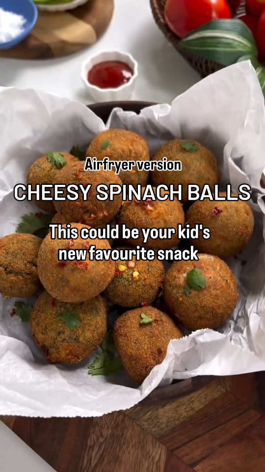 Cheesy spinach balls airfryer version. Protien rich healthy snacks for kids and family too. ➡️INGREDIENTS: 1cup chopped spinach ½ cup boiled sweetcorn ½ cup boiled chickpeas ½ cup besan 3 to 4 garlic cloves 1 teaspoon salt ➡️FOR FILLING: 1 cup grated cheese(mozzarella & cheddar mix)or any one type 1 teaspoon chilli flakes or crushed black pepper 1½teaspoon Chilli powder (optional) ➡️COATING:Bread crumbs ➡️RECIPE: Into a vessel add 2 cups water,add spinach boil & keep aside. ✅️Instead of boiled chickpeas, you can add ½ cup paneer. Now into a mixer jar, add spinach,sweetcorn, boiled chickpeas or paneer,garlic cloves & salt. Grind it into a coarse mixture. Transfer it into a mixing bowl and add besan. Mix it together & keep aside. Now into a separate bowl, add grated cheese,chilli flakes, or crushed pepper , and chilli powder mix it well. Now take a small portion of the spinach mixture, put some of the cheese, and make small balls out of it. Give it a coating with bread crumbs. Transfer all the spinach balls into airfryer,spray little oil, and Airfry at 180° for 15min. ✅️Follow for more healthy child friendly recipes. #snacksforkids #snacksrecipesforkids #kidsrecipes #homemadesnacks #spinachrecipes #healthyrecipes #healthysnackideas #healthysnacksforkids #toddlerrecipies