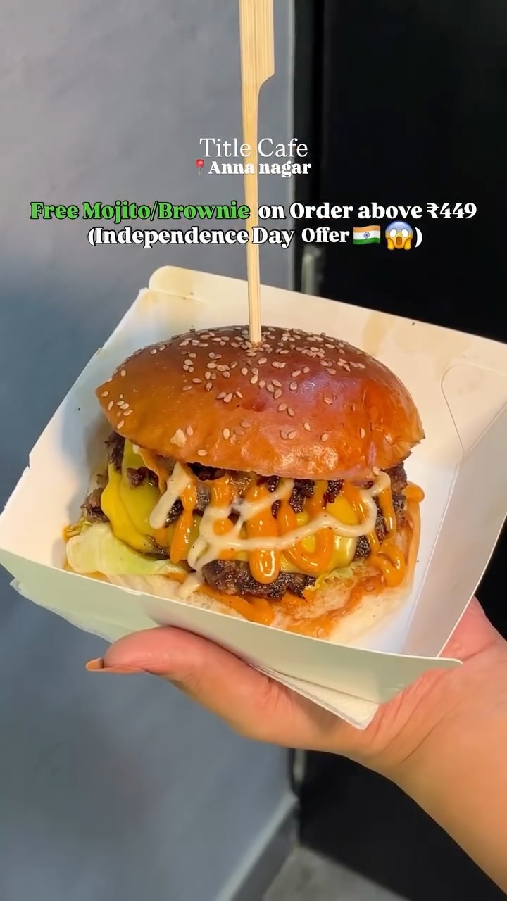 Free Burger ‼️😱 We recently visisted @title.cafe.in This place not only serves some so good food but also holds this amazing offers for this Independence Day ‼️🇮🇳 On this August 15,16&17 1. For customer who spends more than 2000, will have a coupon for 500 for their next bill and the spend limit extends to 3000 after that weekend 2. Free mojito for everyone who spends more than 449 , after that weekend this offer will be only applicable on Mondays and Tuesdays 3. Get your Loyalty card and on your 10th bill you’ll get a free burger 🍔‼️ #explorepage #burgers #foodporn #foodlovers #chennaifood #chennaifoodguide #streetfood #cafe #mojito #reelsininstagram