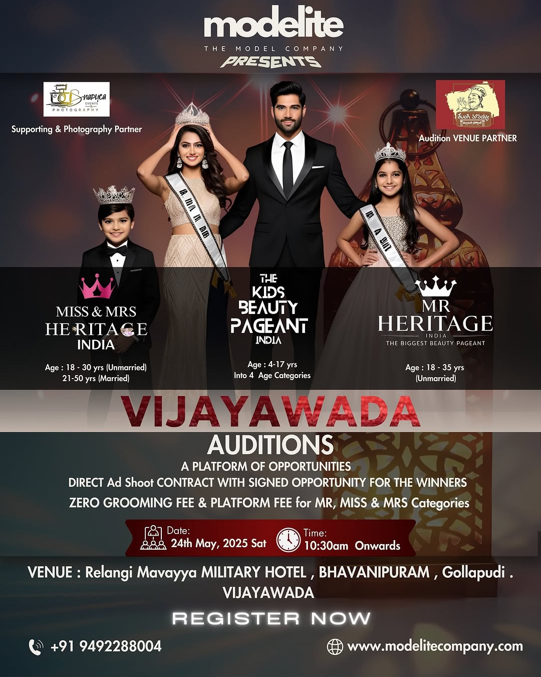MODELITE COMPANY PRESENTS VIJAYAWADA AUDITIONS Date: 24th May 2025 , Saturday Time: 10:30 AM onwards Venue: Relangi Mavayya MILITARY HOTEL, Bhavanipuram, Gollapudi, Vijayawada THE KIDS BEAUTY PAGEANT INDIA Let your little stars shine bright on the grand stage! Age Categories: • Toddler (4–6 yrs) • Prince & Princess (7–9 yrs) • Pre-Teen (10–14 yrs) • Teen (15–17 yrs) MISS & MRS HERITAGE INDIA 2025 Step into the spotlight & own the runway! MISS HERITAGE INDIA (Ages 18–30) Confident. Glamorous. Ready to shine? MRS HERITAGE INDIA (Ages 21–50) Bold, Beautiful & Unstoppable! Celebrate your strength and grace! MR HERITAGE INDIA 2025 MR HERITAGE INDIA (Ages 18–35) Lead with passion, power & presence! BIG OPPORTUNITY – ZERO FEES! NO GROOMING FEE | NO PLATFORM FEE (For Miss, Mr & Mrs Heritage India Categories) AUDITION VENUE PARTNER : @relangimavayyahotel Brought to life with our proud Supporting & Photography PARTNER : SNAPLICA EVENTS & PHOTOGRAPHY @snaplicaofficial & @sonus_drone Spots are limited – Don’t miss your chance to shine! Call Now: 9492288004 For Registrations & Full Details