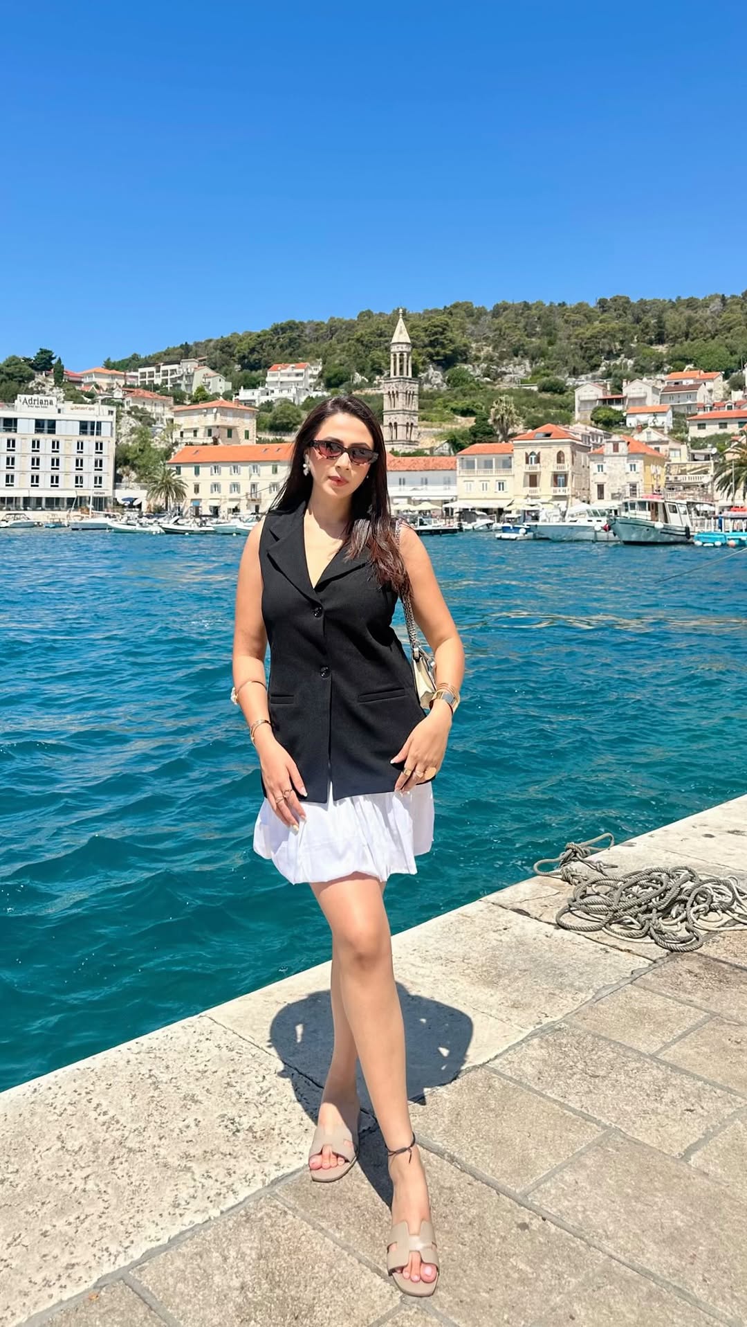 Not sure what’s more picture perfect - this dress or the view! 🏞️🤍☀️🍨 Wearing @moonstruckbyss 🖤🤍 (What I wore vs where I went, Croatia fit check, Coord set inspo, summer blazer ruffle skirt, beach day fit, European vacay wardrobe, vacation look, euro trip, Croatian coast, croatia outfit ideas, hvar old town, Dalmatia holiday, golden hour sunset, Europe travel) #croatiatrip #holidaystyle #travelfit #summeroutfit #vacationvibes #croatia #europe #europetrip #croatiatravel #summerdress #vacaylook #hvar #hvaroldtown #hvartravel #blackandwhitedress