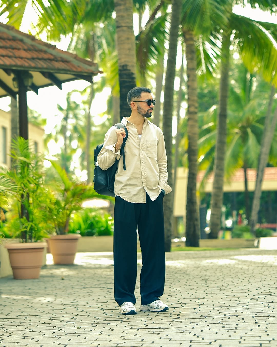 Simple. Sharp. Sorted ✨ ____ Fit :- Shirt @hm_man Trouser @offduty.india Sneaker @newbalancelifestyle Bag @maisoli.in [ outfit, summer outfit, clean fit , black bag , summer fashion ]