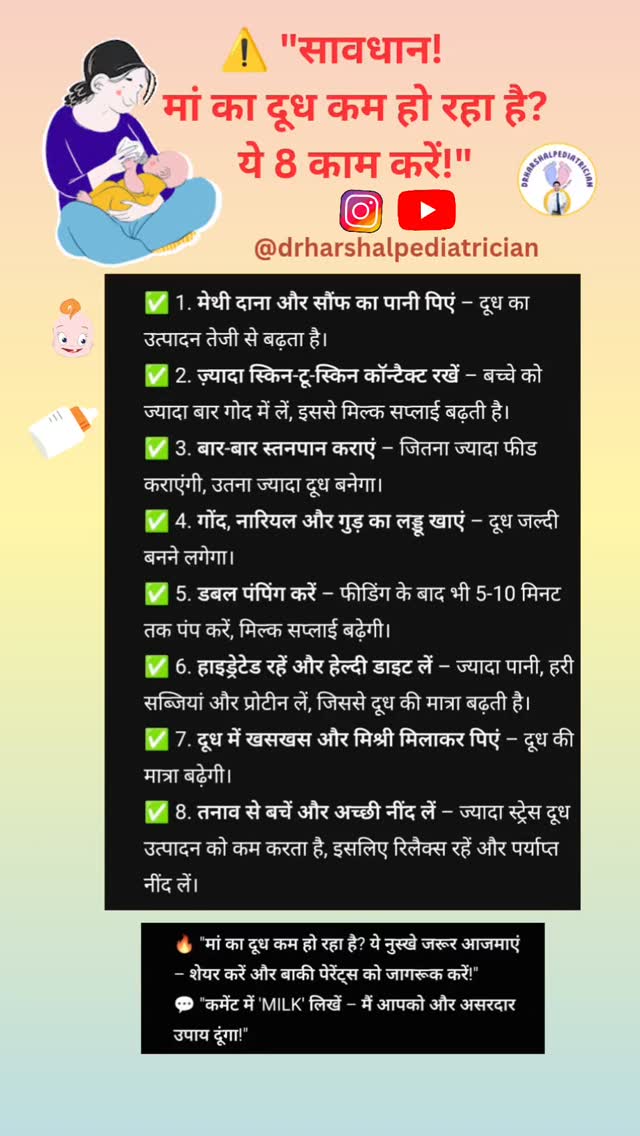 🔥 "मां का दूध कम हो रहा है? ये असरदार तरीके जरूर आजमाएं – शेयर करें और बाकी पेरेंट्स को जागरूक करें!" 💬 "कमेंट में 'MILK' लिखें – मैं आपको और असरदार उपाय दूंगा!" 👶 "ऐसी पेरेंटिंग टिप्स के लिए फॉलो करें ➡️ @drharshalpediatrician" #breastfeeding #babyhealth #newborncare #breastmilksupply #parentingtips #childcare #healthykids #healthtips