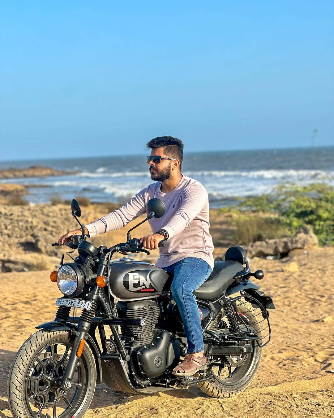 ☀️Sun, sand, and the perfect ride.🤓 #royalenfield #hunterdappergrey #beachlife #hunter #350 #royalenfieldlovers #classy