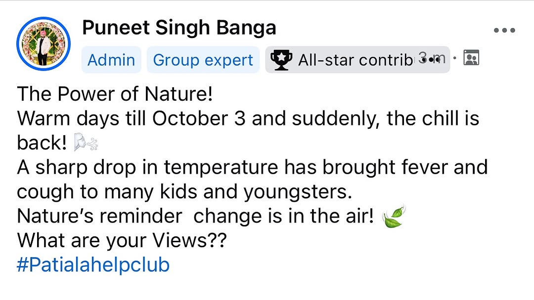 ਕੁਦਰਤ ਦੀ ਤਾਕਤ! 3 ਅਕਤੂਬਰ ਤੱਕ ਗਰਮੀ ਸੀ, ਤੇ ਅਚਾਨਕ ਵਾਪਸ ਆ ਗਈ ਠੰਢ! 🌬️ ਮੌਸਮ ਦੇ ਇਸ ਤਿੱਖੇ ਬਦਲਾਅ ਨਾਲ ਕਈ ਬੱਚੇ ਤੇ ਨੌਜਵਾਨ ਬੁਖਾਰ ਤੇ ਖੰਘ ਦੀ ਚਪੇਟ ’ਚ। ਕੁਦਰਤ ਦਾ ਇਸ਼ਾਰਾ ਤਬਦੀਲੀ ਹਵਾ ’ਚ ਹੈ! 🍃#patiala #punjab #weather #monsoon #patialahelpclub