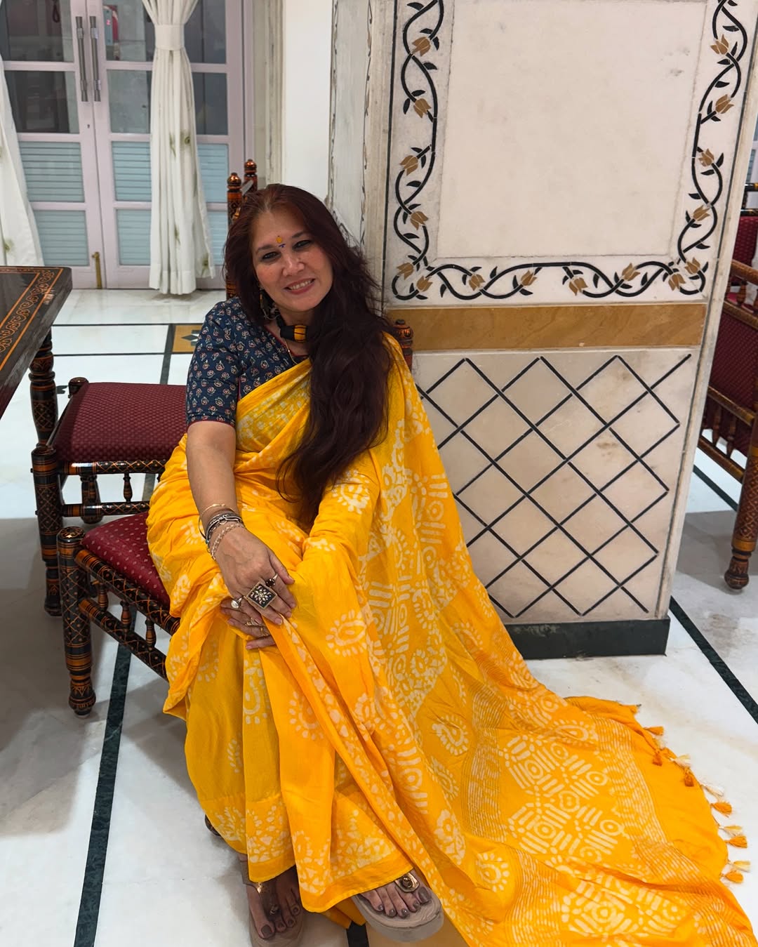 #sareespeak With Navratri getting over it was surely a time to visit Krishna , so today’s outing was all for Krishna darshan, an opportunity created by our dear friend Sudha Tumbe , wherein we were invited for a sumptuous luncheon @ Govindas in Iskon temple. A day surely well spent , was such a fun day ! After the darshan started with a chill lunch ,full of good food, beverages & ( not to forget the delectable aamras as season is on ) & I thoroughly enjoyed the same with puri as we continued our nonstop conversations & laughter !!! Winded up the day with our evening tea/coffee wali Shaam ,clubbed with our photo shoots !! It was one of those simple, perfect days that reminds me how great it is to have good people around. Definitely one for the books ! In my sunshine batik cotton saree , which was a second skin to me considering Mumbais scorching summer . This saree kept me easy breezy all throughout the day , paired with an ajrakh blouse & hand crafted jewelleries were enough to take care of the style quotient #neelamsgoodtimes #lunchparty #womenover40 #funvibes #friendsmeet #somumbai #positivevibes #galgang