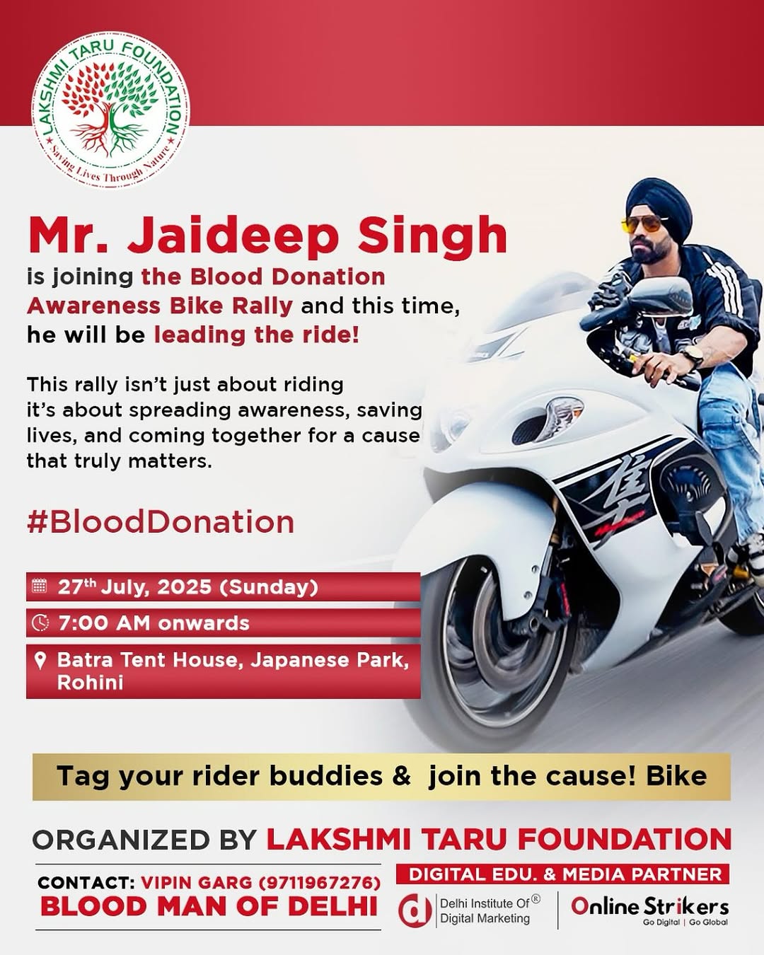 🔥 He’s not just riding — he’s leading the cause! 🩸 Meet Mr. Jaideep Singh, who will be leading our Blood Donation Awareness Bike Rally this year! 💪🏍️ This isn’t just about bikes — it’s about saving lives, spreading awareness, and uniting for humanity. 🗓️ 27th July 2025 (Sunday) ⏰ 7:00 AM onwards 📍 Batra Tent House, Japanese Park, Rohini 👉 Tag your rider gang and join us for a ride that saves lives! Let’s make some noise for a noble cause! ❤️ #BloodDonation #RideForLife #JaideepSingh #BikeRally2025 #MegaBloodCamp #DelhiEvents #LakshmiTaruFoundation #BloodManOfDelhi #RidersForHumanity #JoinTheCause #DelhiBikers