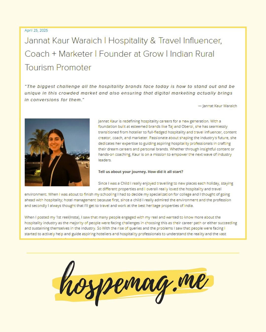 Featured in @hospemag.me ! ✨ Read the complete interview at https://www.hospemag.me/exclusive-interviews/jannat-kaur-waraich (Link in bio), talking about my hospitality journey, passion projects: @growhospitalitymarketing and @ruraltourisminindia , and the future of hospitality marketing.