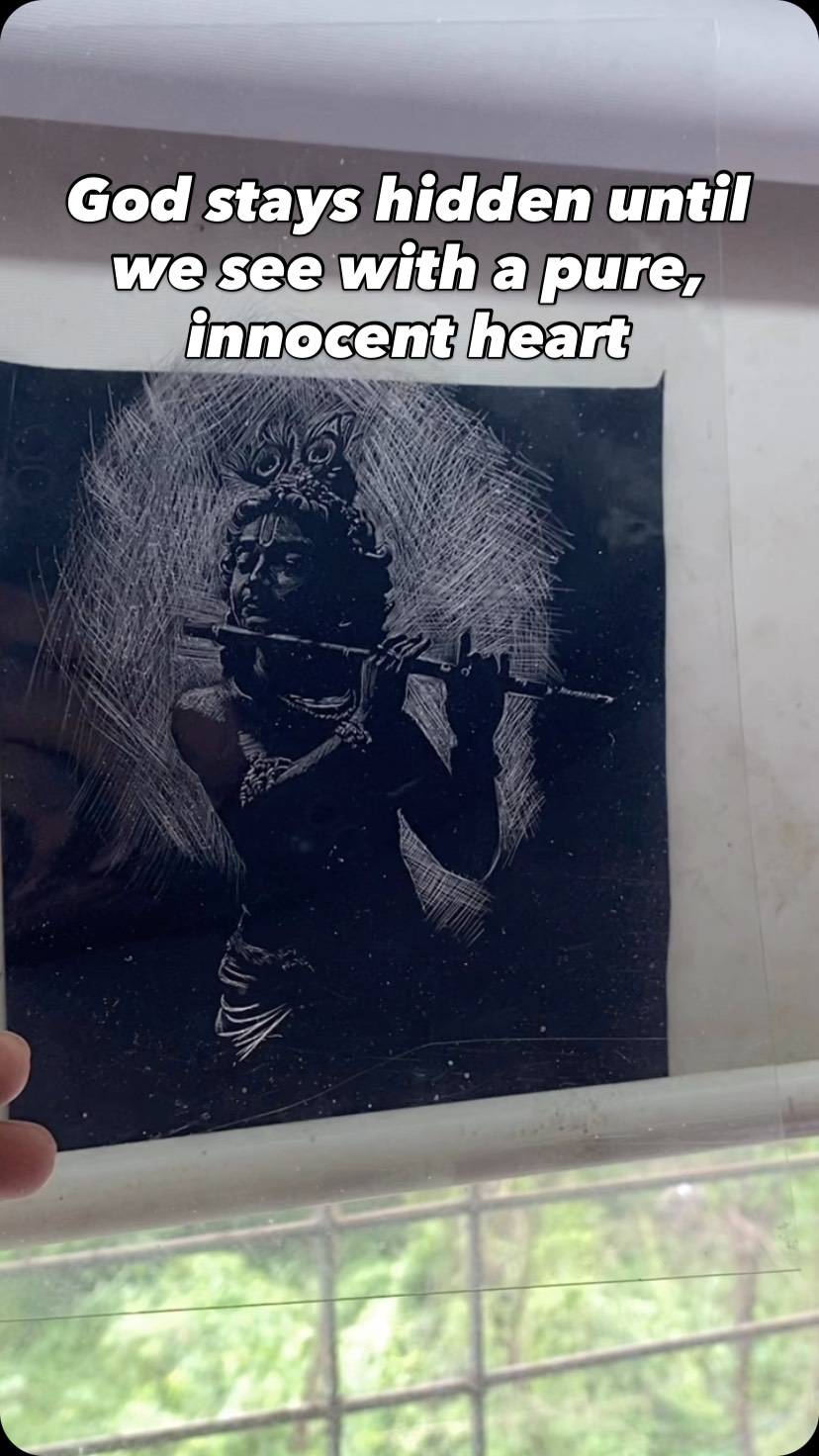 God is always there. But only the innocent heart can see Him. 🕊️🎨 In this art, Lord Krishna remains hidden—until devotion meets darkness. This isn’t just a scratch on a sheet. It’s a message… Let your faith be quiet, and your heart pure. Only then will you see what eyes alone cannot. 🙏🏼 #KrishnaArt #SpiritualArt #DivineVision #ArtWithMeaning #DevotionalArt #KrishnaBhakti #FaithInDarkness #HiddenGod #IndianArtist #KrishnaConsciousness #MagicalArt #HeartSeDekho #BhaktiVibes