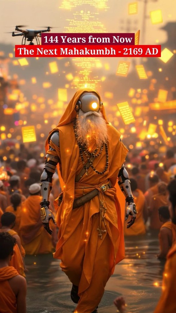144 Years from Now 🌌 The Mahakumbh of 2169 AD Are you ready for the next Mahakumbh? #FutureKumbh #Mahakumbh2169 #SpiritualFuturism #CyborgBabaji #AIandSpirituality #FutureTraditions #KumbhMela #InnovationMeetsTradition #SaffronLight #NextMahakumbh