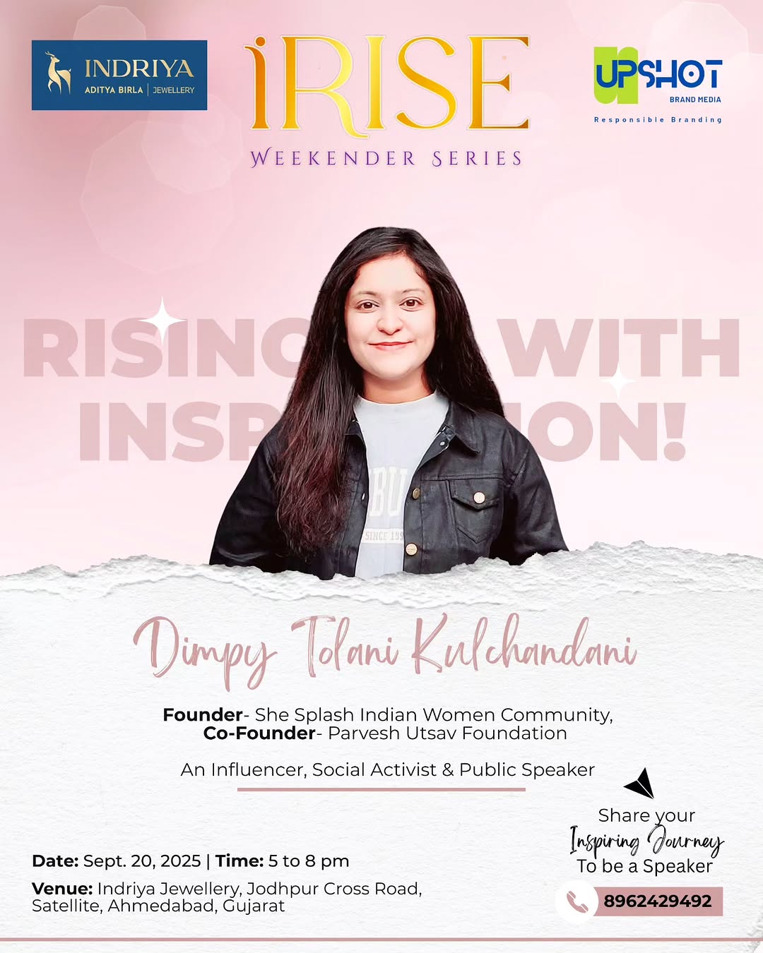 4 days to go and ....time's ticking! Get your 'front seat' inspo with people of Ahmedabad who are the 'movers and shakers' of the town! We're thrilled to hear the story of Dimpy Tolani Kulchandani , Founder- She Splash Indian Women Community, Co-Founder- Parvesh Utsav Foundation for the iRISE Weekender Series. An Influencer, social activist & a public speaker, she is inspiring many women through her community! Join us to hear her inspiring journey and share your own. Rising with inspiration! 🚀 ✨We're bringing together amazing people for the iRISE Weekender Series with an exclusive Fireside Chat with Dy. Collector, Ms. Maitridevi Sisodia. This is your chance to share your journey, connect with like-minded people, and inspire others with your story. Date: Sept. 20, 2025 Time: 5-8 PM Venue: Indriya Jewellery, Jodhpur Cross Road, Satellite, Ahmedabad 🎟 No Charges. Registration is for ensuring proper arrangements at the venue for you. 🔗 Register now: https://forms.gle/zfQK1eFtmw8bbAb16 #Stories #AhmedabadStories #iRiseWeekenderSeries #RisingStories #PeopleofAhmedabad