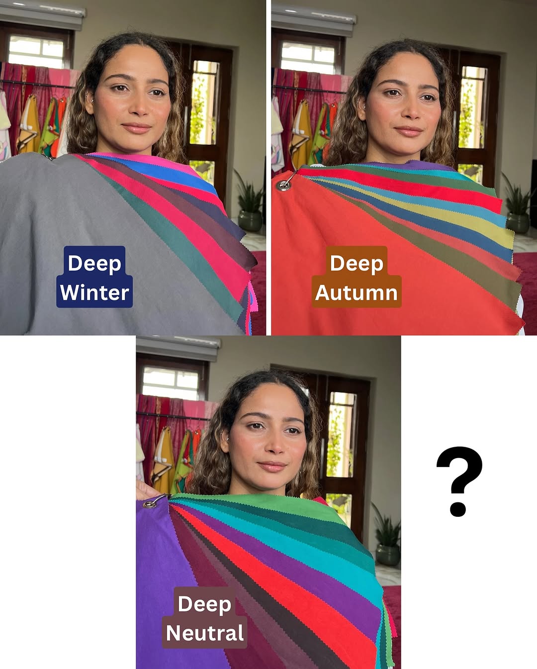 Color test in progress for amazing @deepika.udawat and drop your pick in the poll 👇 Look closely 👀 🔎 Observe how her skin reacts: no shadows, even glow, or slight dullness? 🔎 Do the cool, or the warm shades seem to bring more harmony? 🔎 Or is she a Neutral ? 🔎 How does the depth of each palette interact with her natural coloring? I tested 3 directions — now it’s your turn to guess!