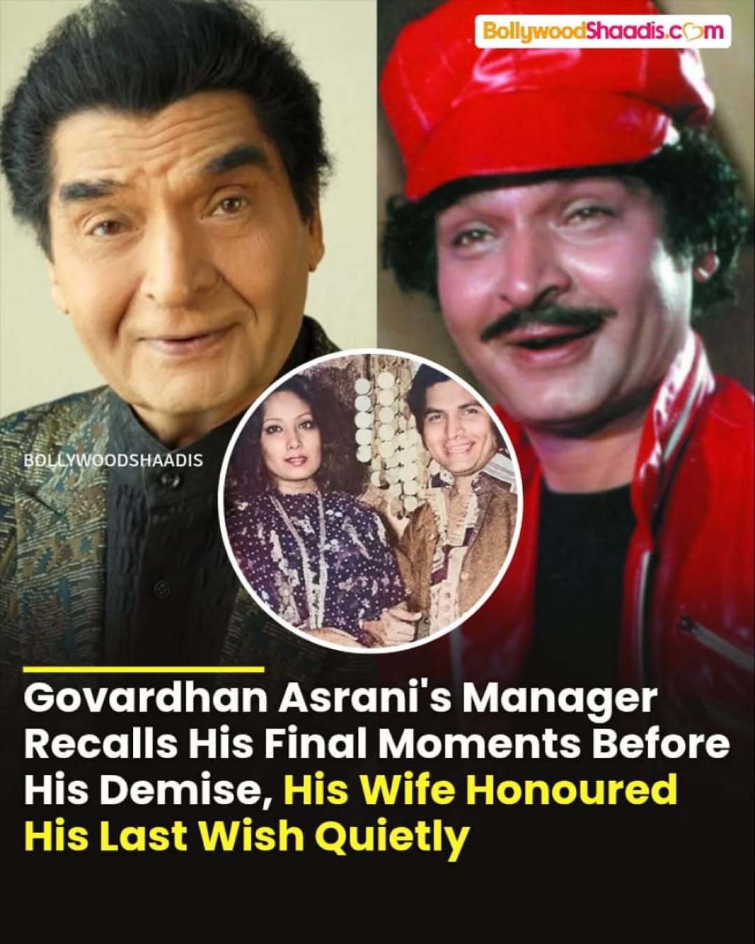 Veteran actor and comedian, Govardhan Asrani passed away on October 20, 2025, at the age of 84. The actor has been suffering from breathing issues, as reported, and was admitted to the hospital. However, it was on October 20, 2025, when he bid farewell to the world, leaving his family and fans heartbroken. It was his manager who confirmed his death, and he also shared some details about the final moments of the actor. Asrani’s contribution to the cinematic world will remain unbeatable. Over a career of five decades, Asrani appeared in more than 350 films, and his sudden demise sparked a sense of grief around. During a media interaction, Govardhan Asrani’s manager, Mr. Thiba revealed that the actor had not been keeping well for the last 15 days, and it was 4 days ago, when he was admitted to the Arogya hospital, due to breathing issues. As per Mr Thiba, Asrani passed away around 3 p.m. on October 20, 2025, and his funeral took place on the same day around 8 p.m. Sharing the condition of Govardhan’s family members, Mr Thiba revealed: “He was not feeling well and was admitted to Arogya Hospital four days ago due to breathing issues, He passed away at around 3 PM today. His last rites were performed at 8 PM today. The family is back home now… very sad.” A report by News 18 revealed that Govardhan Asrani’s wife paid a silent tribute to her late husband by fulfilling his last wish. As per the report, sources shared that Govardhan wanted a quiet and dignified departure from his world. If the report is to be believed, Govardhan, even though he was a famous man, wanted to be remembered as a common man. To read further, here’s the link: https://www.bollywoodshaadis.com/articles/govardhan-asranis-passed-away-funeral-69970 #govardhanasrani #bollywood #actor #comedian #demise #funeral