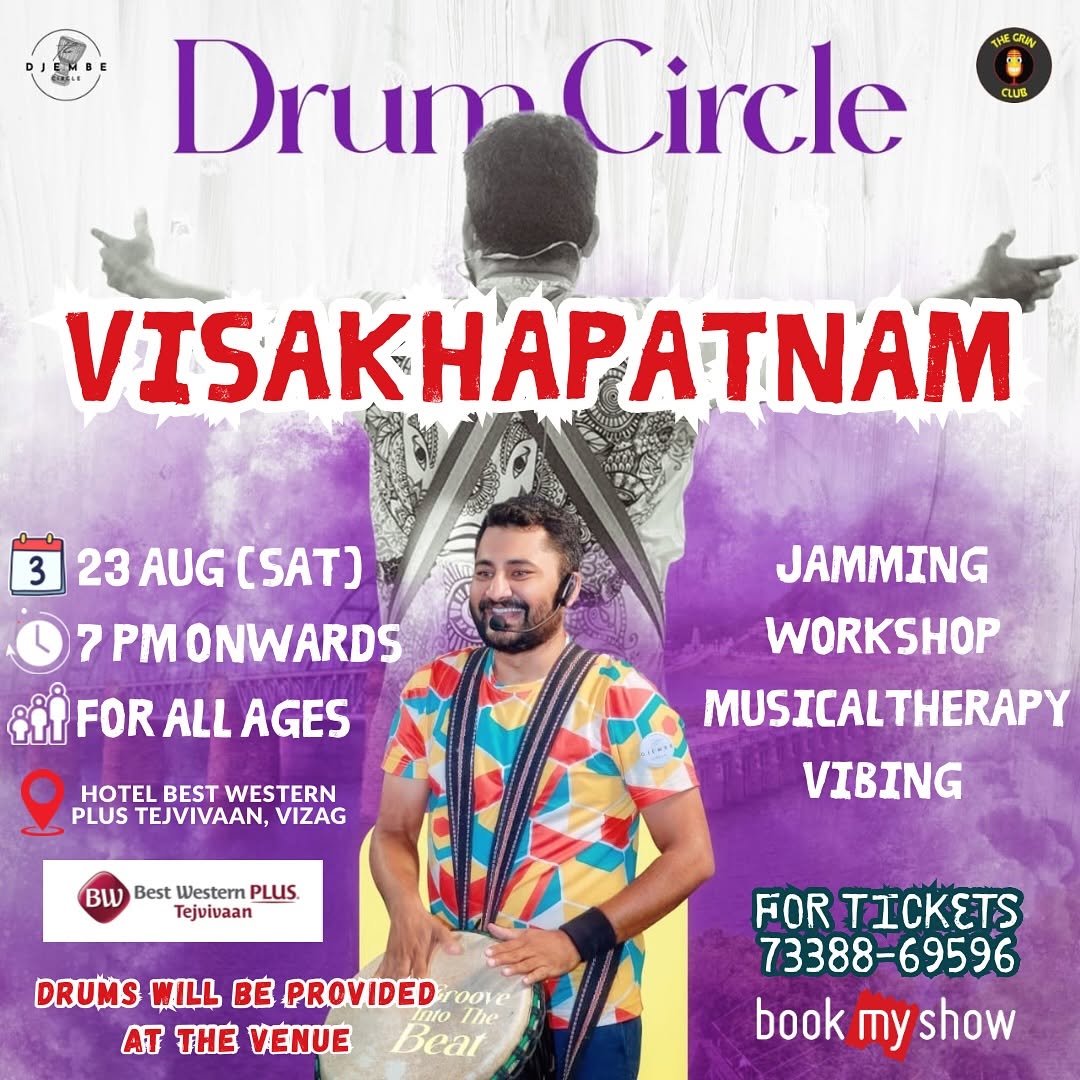 VIZAG !! Get ready to vibe with the first ever Drum Circle event in your city !! This is a combination of : Jamming + Workshop (you get djembe drums at the venue) + Musical Therapy (different kinds of music are being played in the session) 🗓️ Date - 23 August, 7 PM 📍 Location - Hotel Best Western Plus, Tejvivaan, Vizag 🎫 Tickets - 7338869596 / Bookmyshow #thegrinclub #vizag #drumcircle #jamming #musical #therapy #workshop #visakhapatnam