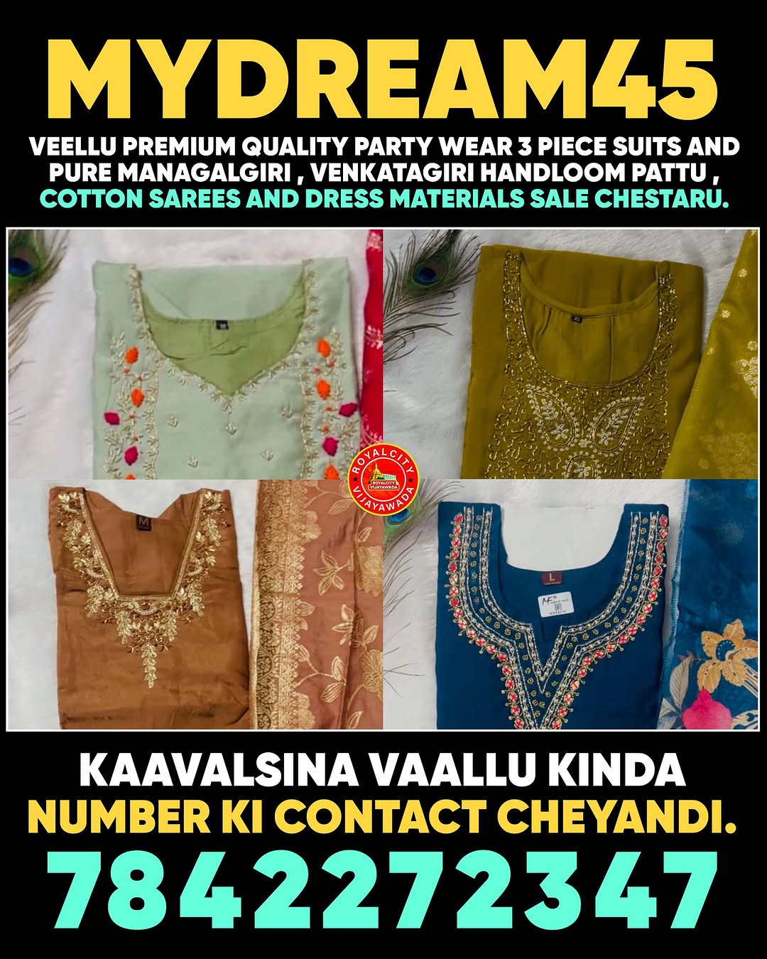 Premium quality party wear 3 piece suits and pure managalgiri , Venkatagiri handloom pattu , cotton sarees and dress materials. Now Diwali offer buy one party wear dress @1100/- 2 @ 1050/- each and 3 @ 1000 /- each For orders WhatsApp ; 7842272347 #royalcityvijayawada #vijayawadacity #durgamma #jaidurgabhavani #indrakeeladri #naturephotography #vijayawadablogger #vijayawadadiaries #pvpsquaremall #vijayawadaupdates #bezawada🔥 #bezawada #vijayawadagirls👌💪👰👧👩 #vijayawadasnature #vijayawadaphotography #vijayawadamemes #prakashambarrage #kanakadurga_vijayawada #benzcircle #trendsetmall #mgroadvijayawada #besantroad #pvpsquaremall #shopping #womenswear #clothing #dresses #womeninbusiness #womenempowerment