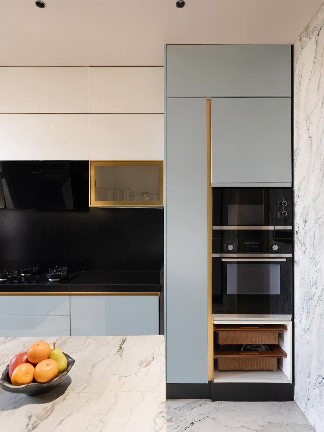 I have been obsessed with this kitchen & especially its colours ! We have used the most perfectly refreshing baby blue that creates such an airy vibe 🤍✨ . . . . . . . . . . . . #aesthetickitchen #aesthetickitchenware #aesthetickitchens #bluekitchen #bluekitchencabinets #bluekitchenisland