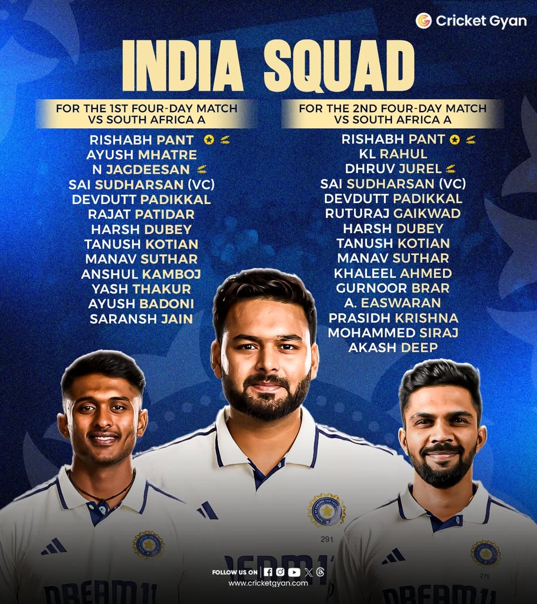 🚨Rishabh Pant is Back🚨 India A squad for four-day matches against South Africa A announced  The Senior Men’s Selection Committee has picked India A’s squad for the two four-day matches to be played against South Africa at the BCCI Centre of Excellence, Bengaluru. . . Rishabh Pant, Indian Cricketer, India A Squad, South Africa, cricket, Cricket News, Cricket Updates, Cricket Gyan