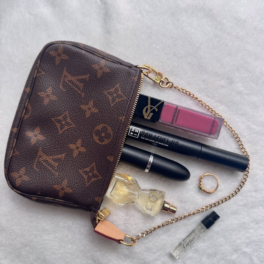 My absolute favourites 🤍 . . #whatsinmybag #lvpochette #lv #ysl #yslbeautytw #mac #makeup #gautier #jeanpaulgaultierparfüm #aesthetics #pinterest #luxurylifestyle #luxury