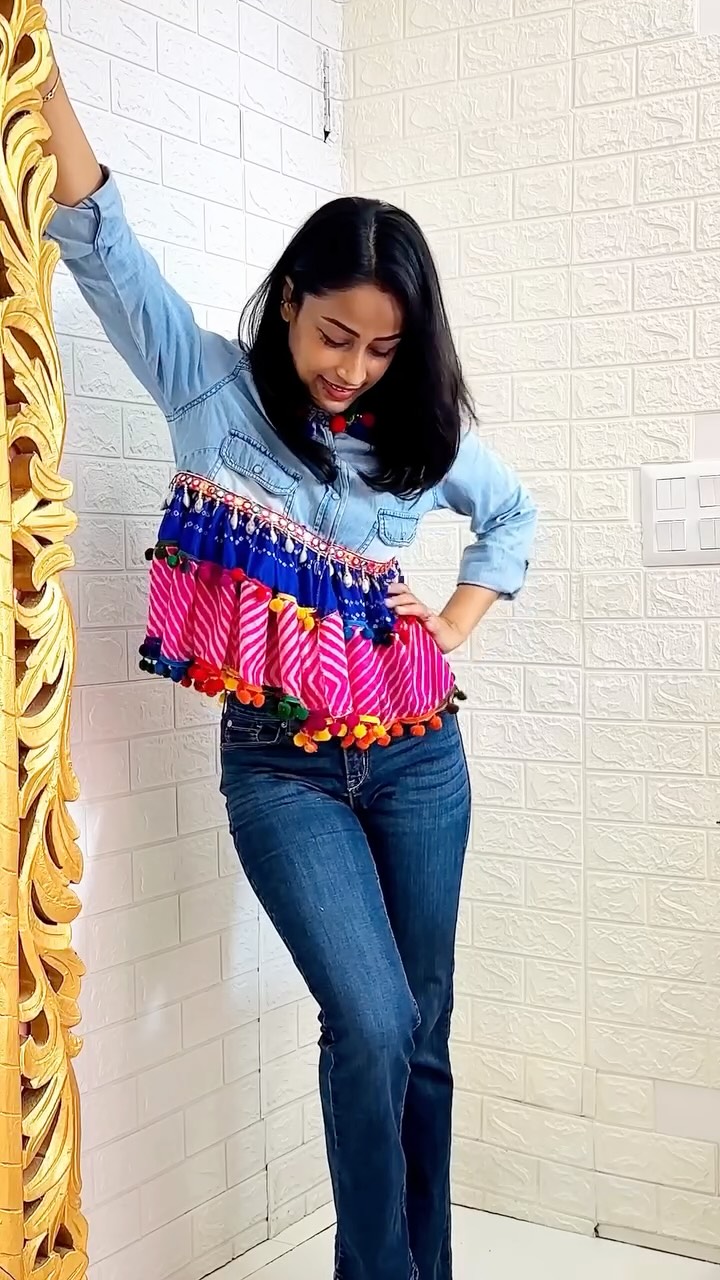 #9DAYs9DIYs This shirt is very old and I it’s embroidery on collar is already damaged, so it’s a new life for this one..!! Used leftover saree fabric from my boutique’s time.. saree fabric is also very delicate.. anyway let me know how is it? #navratri2025 #navratridiy #navratrioutfit