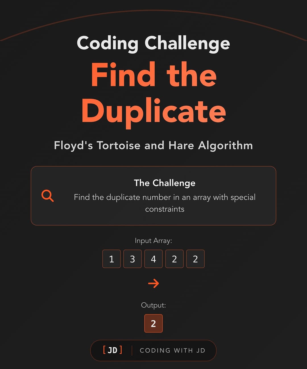 Find the Duplicate – Floyd’s Tortoise and Hare Algorithm Sounds fancy, right? But it’s actually a smart and efficient way to detect cycles — and yes, find duplicates in arrays too! 😎 📌 Uses two pointers (slow & fast) 📌 No extra space needed 📌 Runs in linear time – super efficient! It’s one of those cool algorithms you’ll see in coding interviews 👀 👉 Save this post if you’re prepping for interviews! ❤️ Like & 🔁 Share with your dev friends 🚀 Follow @codingwithjd for more algorithm gems!
