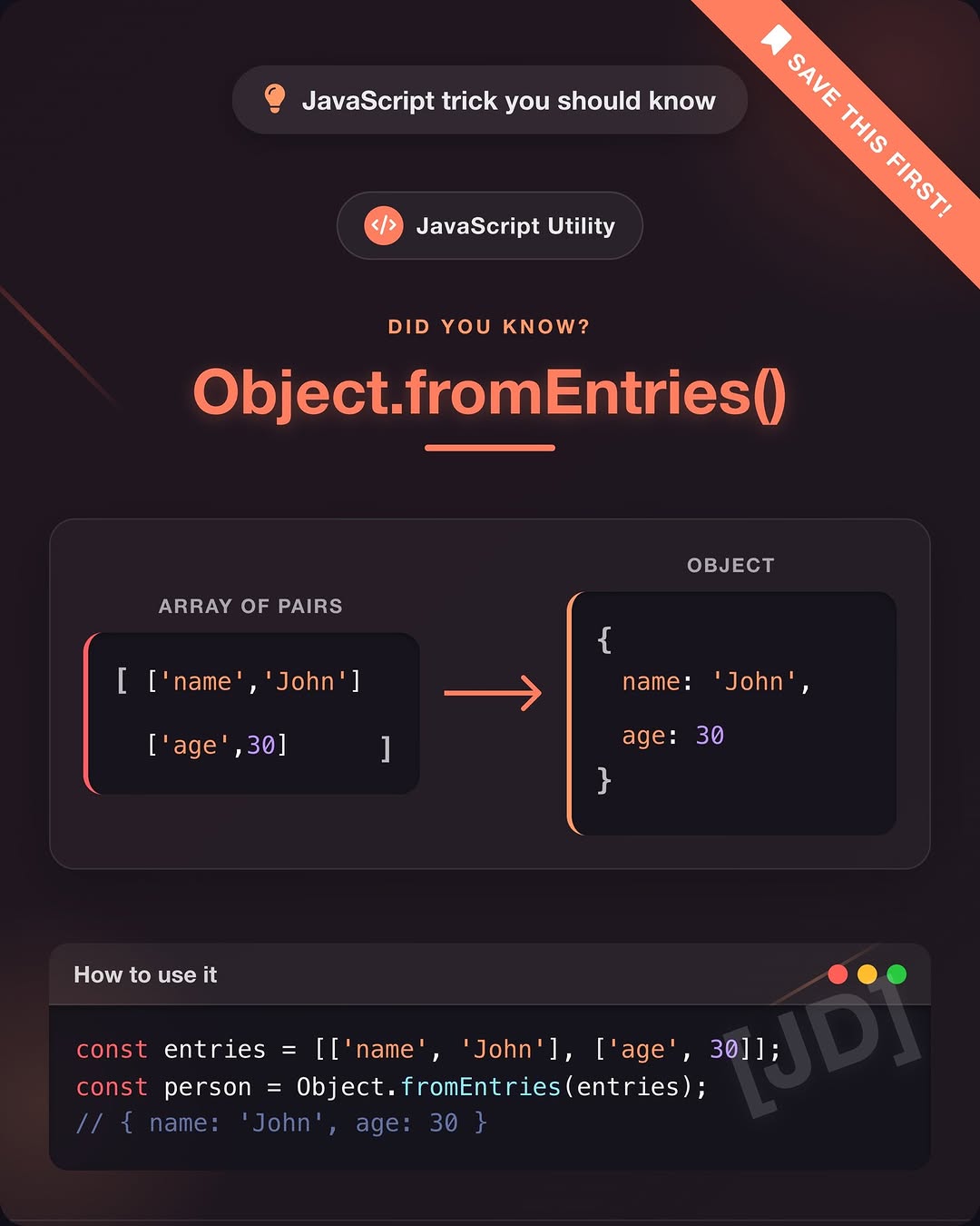🧩 JavaScript Quick Tip: Object.fromEntries() Ever had a bunch of key-value pairs and wanted to turn them into an object? That’s exactly what Object.fromEntries() does — and it makes life so much easier! 😄 📌 It takes an array of key-value pairs and turns it into a proper object 📌 Super handy when working with Map or Object.entries() It’s one of those simple tricks that feels like magic ✨ 👉 Save this for later ❤️ Like & 🔁 Share if you learned something new 🚀 Follow @codingwithjd for more easy JavaScript tips! #javascript #webdev #codingtips #developerlife #learntocode #codingwithjd