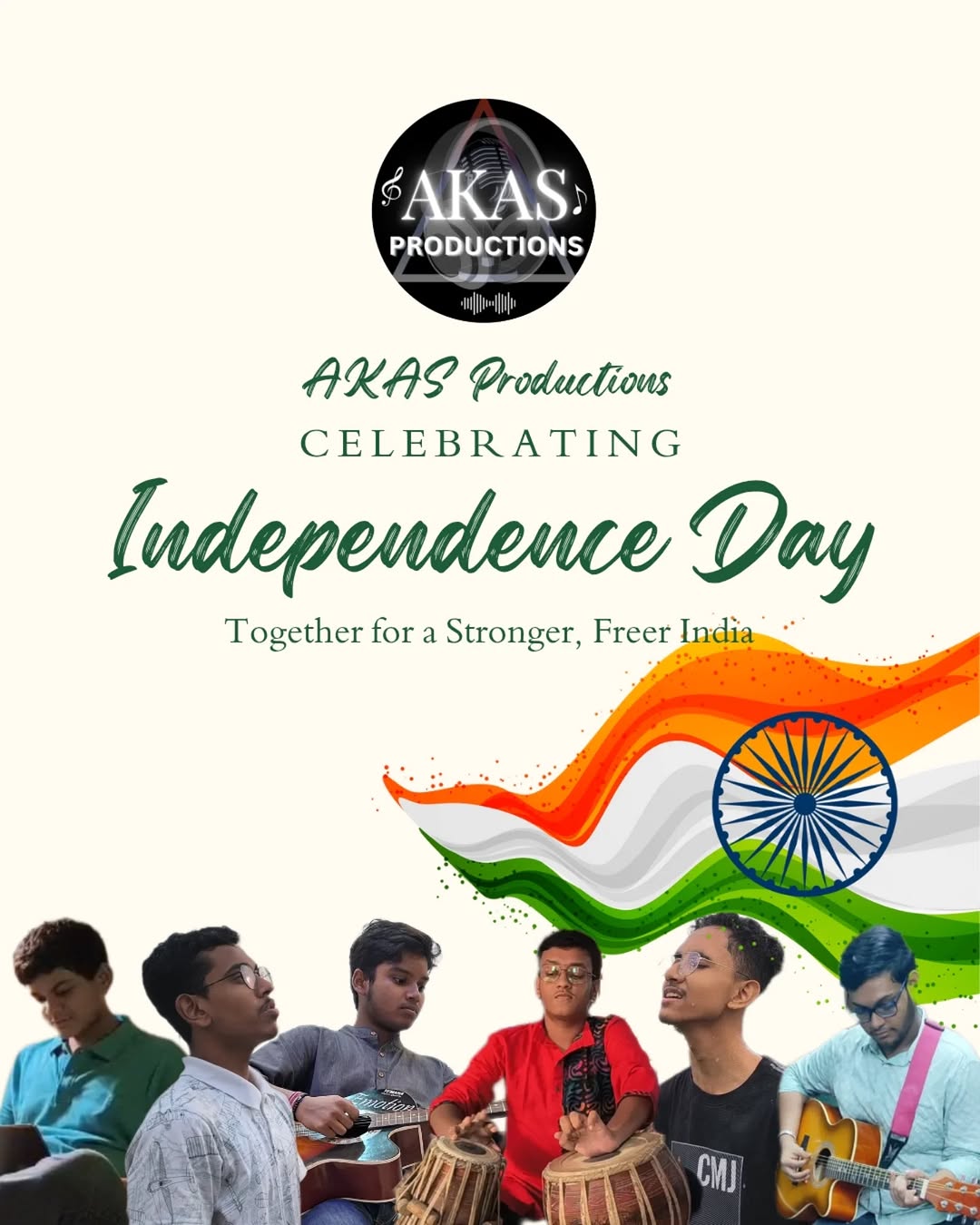 Strumming chords of unity, beating rhythms of freedom... AKAS Productions wishes you a Happy Independence Day!...🇮🇳✨🧡🤍💚 . . . #independenceday #akasproductions #togetherforindia