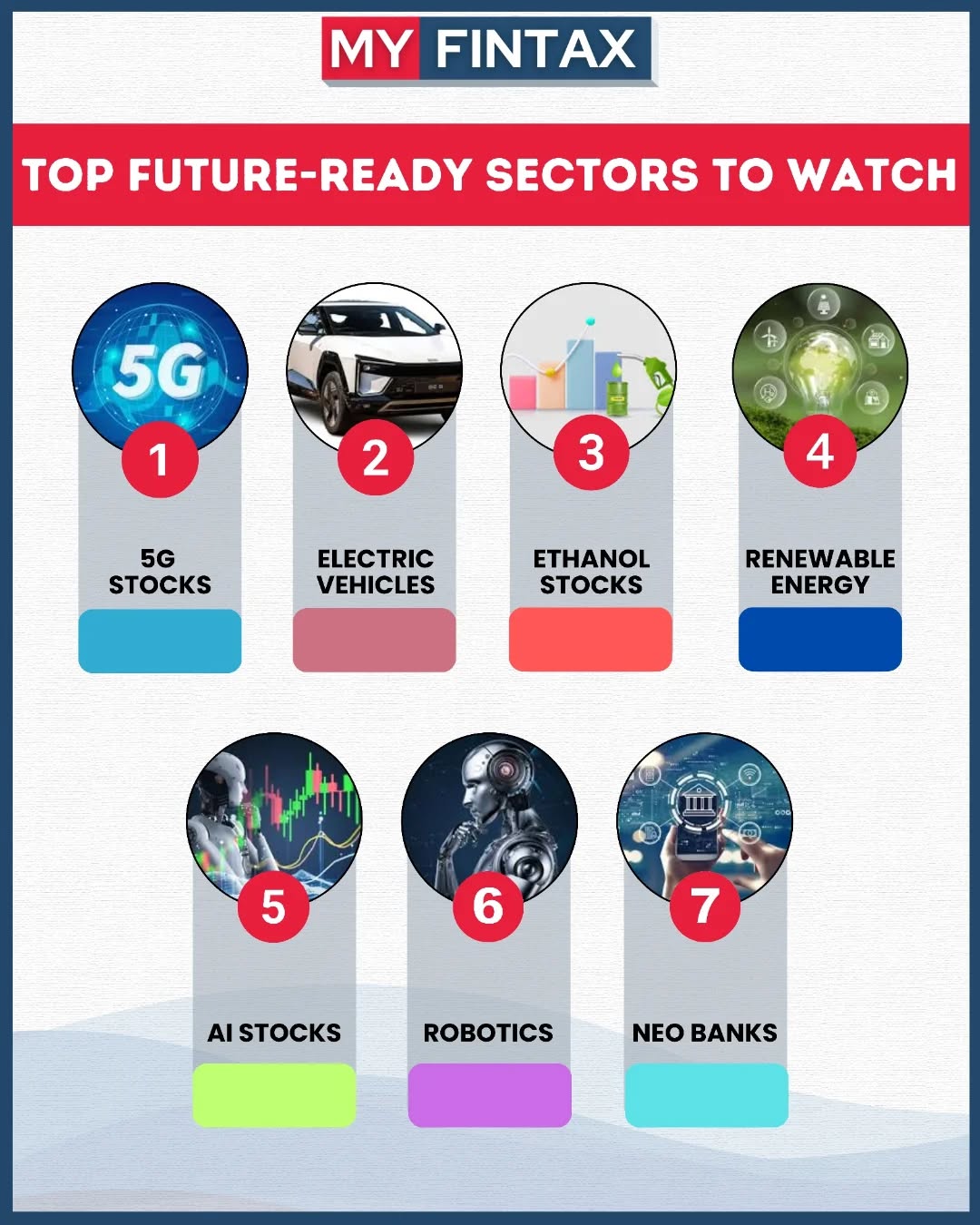 🚀 Top Future-Ready Sectors to Watch in 2025 & Beyond! From 5G to AI, and Electric Vehicles to Renewable Energy, these are the industries shaping India’s next decade of growth. 💡📈 👉 Start researching & investing early — the future belongs to the visionary! Follow @myfintaxofficial for more finance insights, market trends & smart investment ideas. 💰 #myfintax #futurestocks #investingindia #stockmarketindia #5Gstocks #electricvehicles #renewableenergy #AIstocks #robotics #neobanks #ethanolstocks #financeeducation #wealthcreation #longterminvesting #nifty50 #sensex #financialfreedom #investsmart #myfintaxofficial