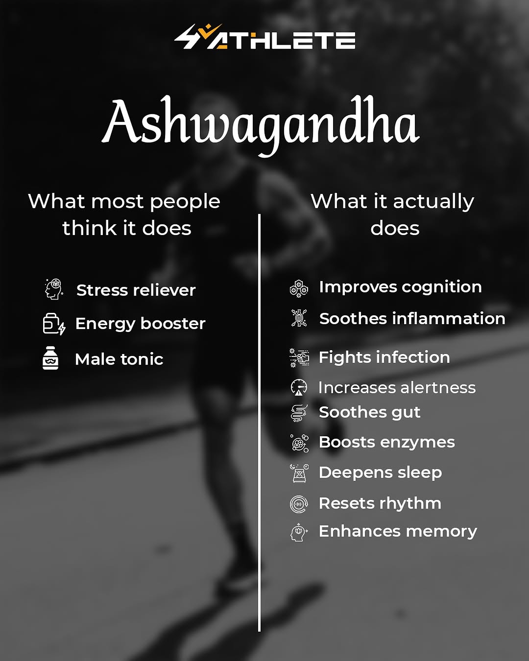 Most people take Ashwagandha thinking it’s just for stress or energy… But the truth? It’s a total body & mind upgrade. 🌿🧠💪 From deeper sleep to sharper focus, better digestion to boosted memory — Ashwagandha quietly supports you in more ways than you even realize. It’s not just a supplement. It’s self-care backed by nature. 🌱 #4athlete #athletenutrition #sportsnutrition #fuelyourperformance #trainhardrecoverharder #athletelife #supplementsmart #peakperformance #evidencebased #sciencebacked #sportsfuel #recoveryfuel #nutritionforathletes #performbetter #builtbyathletes #strongfromwithin #fitfuel #grindmode #nextlevelnutrition #trainlikeapro #gameready #athletefuel #smartgains #strengthandscience #eatforsport #onandoffthefield #informedathlete #sportssupplements #fuelrecoverrepeat #nutritionmindset