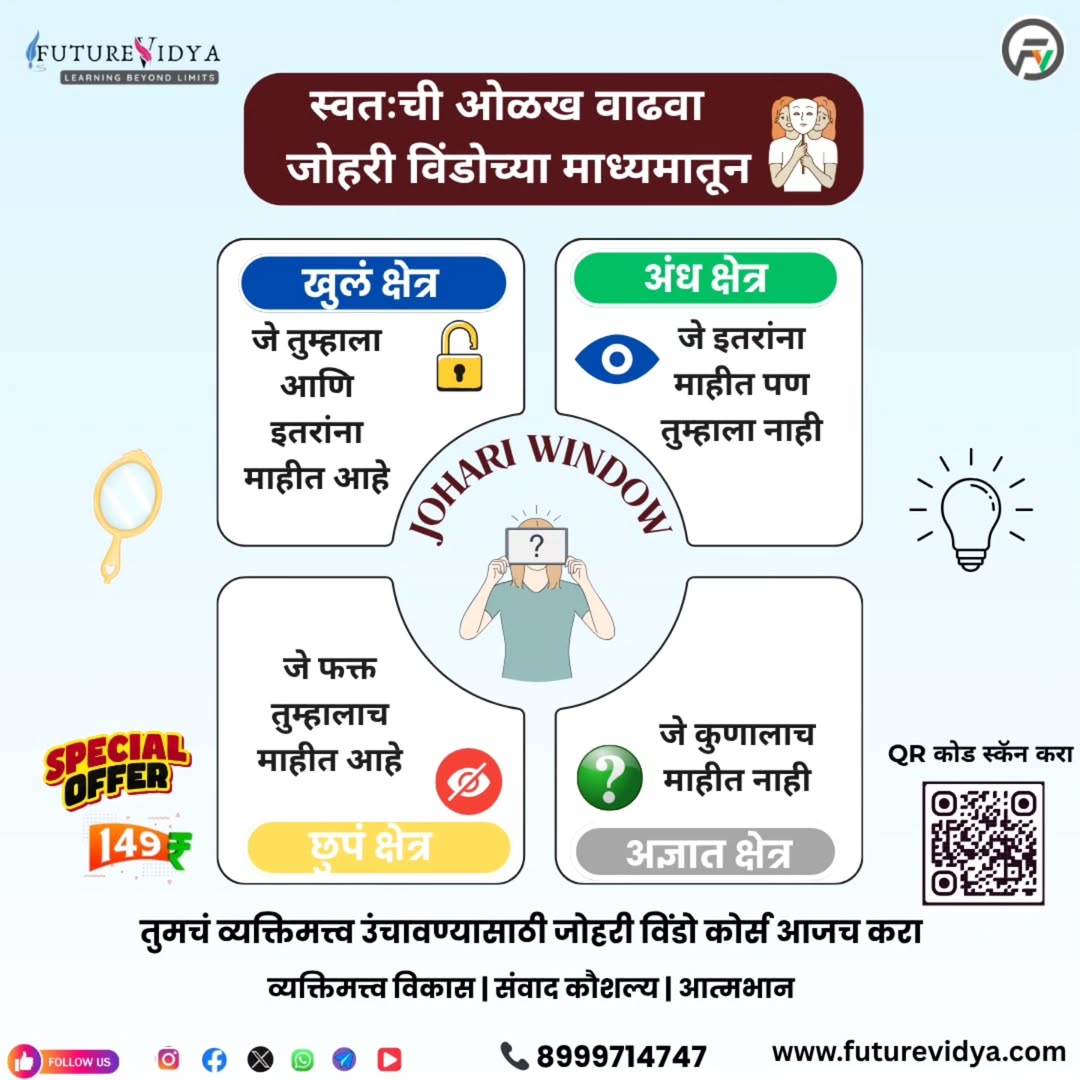 🔍 स्वतःची ओळख वाढवा – #जोहरी विंडोच्या माध्यमातून! तुम्ही स्वतःला किती #ओळखता? ...आणि इतर लोक तुम्हाला कसे #पाहतात, हे तुम्हाला माहित आहे का? 💡 #Johari_Window ही मानसशास्त्रीय संकल्पना आहे, जी #स्व-भान, #संवाद कौशल्य आणि #नातेसंबंध सुधारण्यासाठी वापरली जाते. 🟦 #खुलं क्षेत्र – जे तुम्हालाही आणि इतरांनाही माहिती आहे 🟩 #अंध क्षेत्र – जे इतरांना माहिती पण तुम्हाला नाही 🟨 #छुपे क्षेत्र – जे फक्त तुम्हालाच माहिती आहे ⬜ #अज्ञात क्षेत्र – जे कुणालाच माहिती नाही 🎯 #FutureVidya प्रस्तुत – जोहरी विंडो कोर्स फक्त ₹149 मध्ये! 📈 आत्मभान | व्यक्तिमत्त्व विकास | प्रभावी संवाद ✅ QR कोड स्कॅन करा ✅ आजच कोर्स सुरू करा ✅ स्वतःमध्ये बदल अनुभवा! 📞 संपर्क: 8999714747 🌐 कोर्स लिंक👇 https://www.futurevidya.com/courses-page/jw \ #JohariWindow #SelfAwareness #PersonalityDevelopment #FutureVidya #मराठीशिक्षण #OnlineCourse #CommunicationSkills #SelfGrowth #मराठीपोस्ट #मराठीशाळा #zpschool