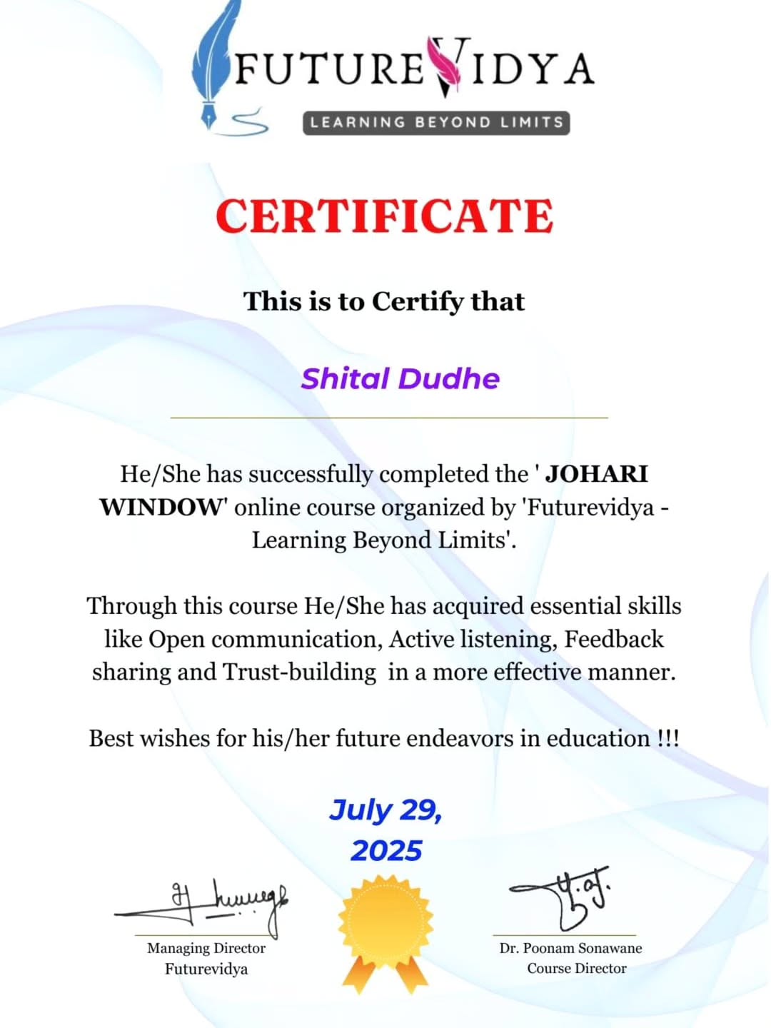 #जोहरी_विंडो म्हणजे स्वतःला समजून घेऊन आत्मपरीक्षणाने परिवर्तनाची पाऊलवाट स्वीकारण्याचा प्रभावी मार्ग.. 👉आज प्रत्येक नात्यातील #संवाद कुठेतरी हरवलेला दिसतो, त्यांचे दुष्परिणाम टाळण्याचा प्रकाशित मार्ग... 👉 हा कोर्स आज प्रत्येकाने करावा असाच आहे मानुष्य म्हणून आपण अनेक #भूमिका साकारतो या भूमिका साकारताना नक्कीच खुली खिडकी, अज्ञात खिडकी अंधारी खिडकी व छुपी खिडकी या चारही खिडक्यांना समजून घेऊन,उपयोग करून तो उत्तम #यशस्वी जीवन जगू शकतो. 👉 मुल- पालक- शिक्षक, व्यवसाय किंवा कोणत्याही भूमिकेतील व्यक्ती ह्या कोर्स द्वारे #आत्मजागृत बनवून संवाद कौशल्य द्वारे स्वतःला व इतरांना जाणून घेऊन यशस्वी वाटचाल करू शकतो. 👉 संवाद कौशल्य, सहकार्य, भावनिकता,स्वतःला व इतरांना समजून घेण्याचा एक #दीपस्तंभ म्हणजे जोहरी विंडो..... प्रशिक्षण किंवा कोर्स नाही तर एक #आत्मपरीक्षणाची वाटचाल करायची आहे तर जोहरी विंडो हा कोर्स नक्की करा..... open the window ही सूचना वर्गात देता ना.... मग या माध्यमातून विंडोज ओपन करा.....मनातील खिडक्या उघडा!!! ✍️शितल प्रल्हादराव दुधे पदवीधर विषय शिक्षिका पं. स. नेर, जि. यवतमाळ
