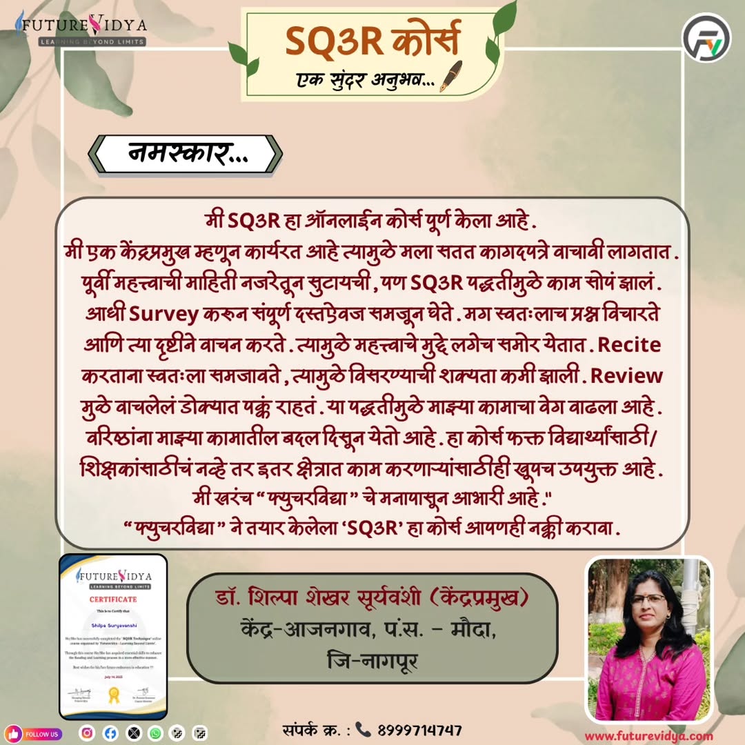 🌿 #SQ3R कोर्स – एक सुंदर अनुभव! 🌿 शिकण्याच्या प्रक्रियेत आपले लक्ष, समज आणि स्मरणशक्ती सुधारण्यासाठी एक उत्तम तंत्र म्हणजे SQ3R पद्धती. 📖 Survey – Question – Read – Recite – Review या पाच टप्प्यांद्वारे शिकणे म्हणजे फक्त वाचन नव्हे, तर #सक्रिय_विचार, #पुनरावलोक आणि #वाचन आत्मसात करणे! डॉ. शिल्पा शेखर सूर्यवंशी (केंद्रप्रमुख) यांनी FutureVidya चा हा कोर्स पूर्ण केला असून त्यांचा #अनुभव खरंच #प्रेरणादायी आहे. त्या म्हणतात — “मी एक #केंद्रप्रमुख म्हणून सतत वाचन असते. #SQ3R मुळे माझे वाचन अधिक नियोजनबद्ध झाले. आता प्रत्येक विषयाकडे ‘Survey’ करून पाहते, महत्त्वाचे मुद्दे स्वतःच नोंदवते, आणि ‘Review’ टप्प्यात सगळे स्पष्ट होते. ही पद्धत माझ्या कामाचा वेग, आत्मविश्वास आणि आकलन या तिन्ही गोष्टींमध्ये बदल घडवून आणणारी ठरली आहे.” 💡#SQ3R हे फक्त विद्यार्थ्यांसाठी नाही — शिक्षक, पालक आणि शिक्षणप्रेमी सर्वांसाठी उपयुक्त #तंत्र आहे. 📚 #FutureVidya ने शिक्षण अधिक अर्थपूर्ण, अनुभवाधारित आणि आनंददायी बनवण्यासाठी घेतलेली ही एक उत्कृष्ट पुढाकार आहे. 👉 जर तुम्हाला देखील #वाचनाची पद्धत सुधारायची असेल, तर #SQ3R कोर्स नक्की करून पाहा. हे तंत्र फक्त वाचायला नाही, तर वाचन कायमस्वरूपी लक्षात ठेवायला शिकवते! 🌱 🌐 कोर्स लिंक: https://futurevidya.com/courses-page/sq3r/ 📞 संपर्क: 8999714747 #FutureVidya #SQ3RCourse #LearningBeyondLimits #SmartLearning #StudyTechniques #ActiveReading #LifelongLearning #MarathiEducation #SQ3RMethod #EducationRevolution #FutureReady #LearningJourney #StudySmart