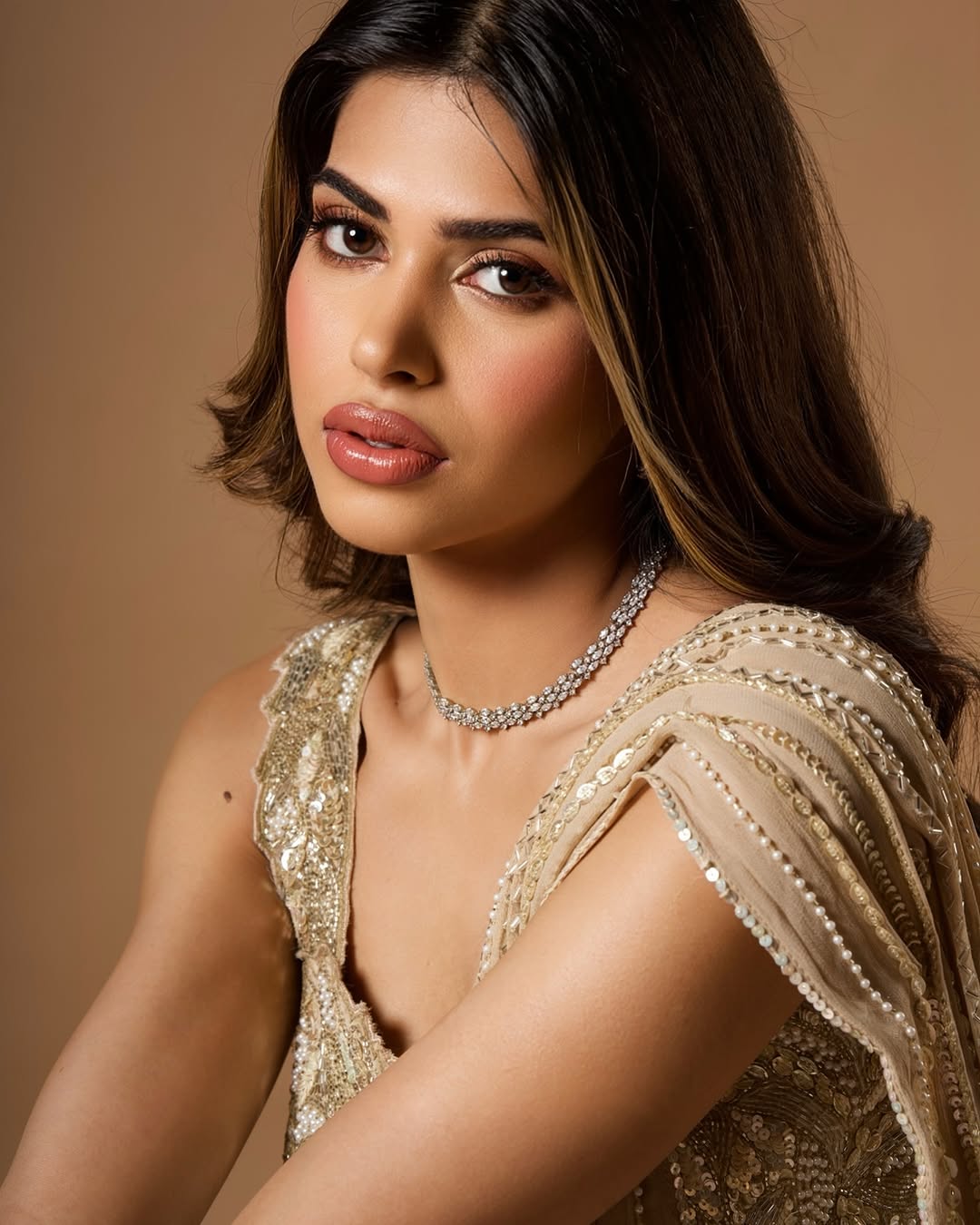 the kind of pretty that prays ✨ 💄 @hues.nhairbykj 📸 @panthera.studios_ @panthera.ma [ethereal aesthetic, Indian fashion, soft glam, traditional look, sari outfit, glowing skin, elegant portrait, aesthetic photography, beauty editorial, golden hour look, Explore Page , Indian ]