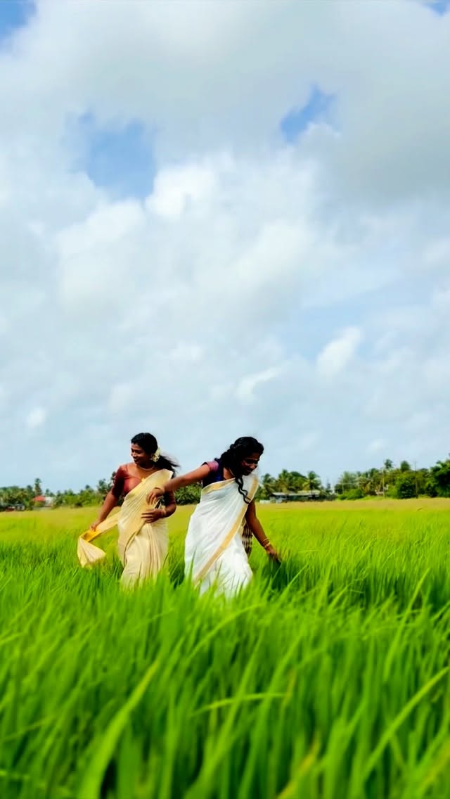 Saree flowing, breeze blowing — Onam in harmony with nature. 🌼🌿 Happy Onam❤️. MUAH @kshetramakeup__by_aparna #onamvibes #nature #cousins