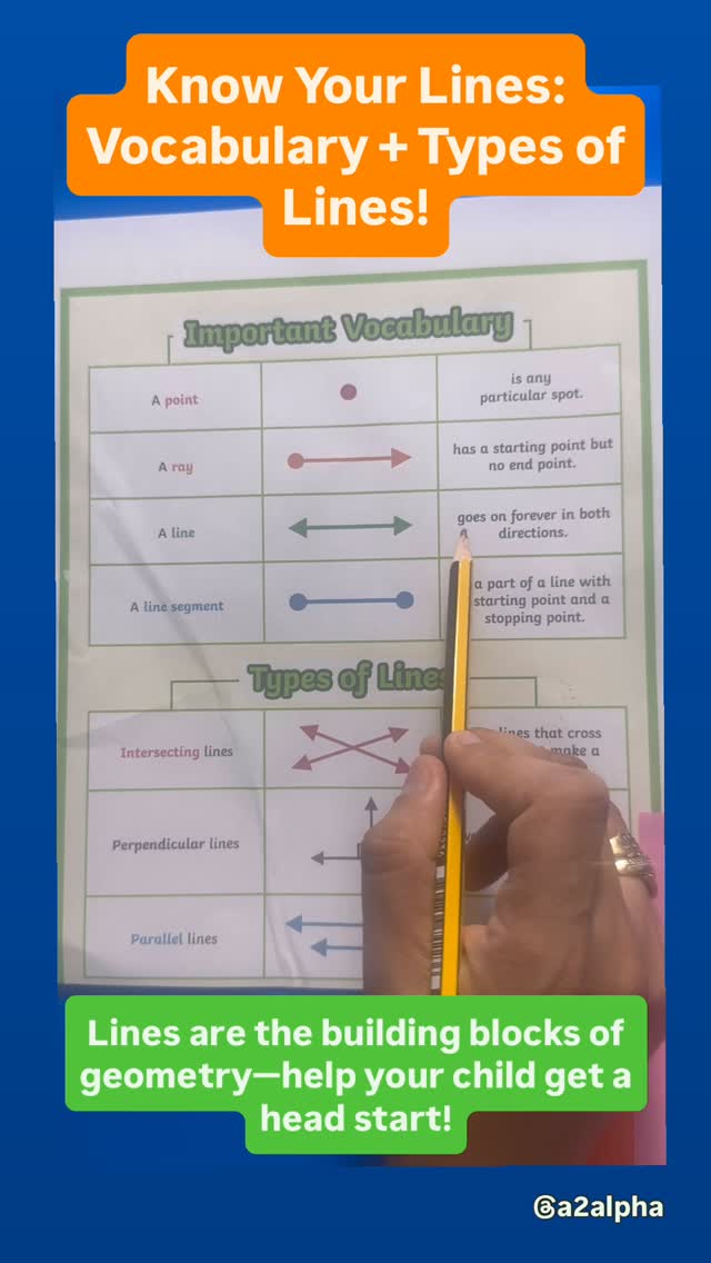 Today we explored the different types of lines — a must-know topic in early geometry! From points and rays to parallel and perpendicular lines, understanding these basics helps children sharpen their observation, drawing, and problem-solving skills. This colorful chart makes it easy for kids to visually grasp key line concepts like: ✔️ What is a point? ✔️ What’s the difference between a line and a line segment? ✔️ How do lines intersect or run parallel? Whether your child is just getting started with geometry or reviewing concepts for Grade 2–3, this quick lesson is a perfect hands-on learning aid. 🎯 Boost visual thinking. 🎯 Build a strong foundation in shapes and math vocabulary. 🎯 Great for screen-free learning sessions at home! 📝 Save this post as a reference for your next math revision! 🔔 Don’t forget to share it with another parent or teacher who’d love this! 🧡 Follow me @a2alpha for daily screen-free learning tips, DIY worksheets, and fun educational content made for real-life parenting! #typesoflines #kidslearning #homeschoolmath #mathforkids #geometrybasics #educationalvideos #learnwithfun #screenfreekids #mathworksheets #visuallearning #montessorimath #earlylearning101 #mathactivities #mathskills #homeschoolingmom #printablesforkids #teachermom #kidsofdubai #mathforkindergarten #grade2math #grade3math #interactivelearning #linesforkids #kidsmathfun #parentingdubai #dubaimoms #momfluencerdubai #a2alpha #stemforkids #mathmadeeasy 📌 types of lines for kids, geometry basics for grade 2, lines and angles worksheet, interactive math learning, homeschool math activities, early geometry lesson, math vocabulary for children, screen-free math activity, how to teach types of lines, educational video on lines for kids