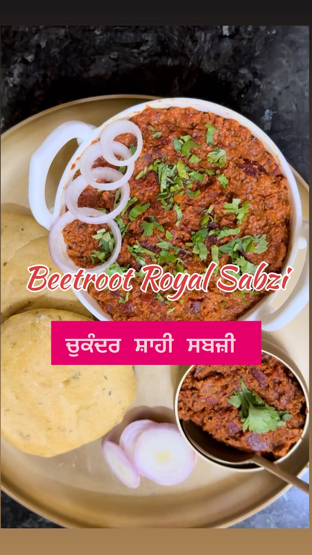 Chukandar Shahi Sabzi/ ਚੁਕੰਦਰ ਸ਼ਾਹੀ ਸਬਜ਼ੀ Ingredients: • 2 medium beetroot, peeled and chopped • 1 potato, peeled and diced • 1 onion, chopped • 1 tomato, chopped • 2 tsp ginger-garlic paste • 1/2 tsp turmeric powder • 1 tsp salt (adjust to taste) • 1/4 cup water For the paste: • 1 cup grated coconut • 2 tbsp poppy seeds • 2 tbsp roasted chana dal • 1-inch cinnamon stick • 3-4 green cardamom pods • 3-4 cloves • 1/2 tsp fennel seeds For the tadka (tempering): • 2 tbsp oil • 1 bay leaf • 1 tsp cumin seeds Method: 1. Cook the Vegetables: • Add the chopped beetroot and potatoes to the pressure cooker add turmeric and salt with little bit of water and cook till 3 whistles 2. Prepare the Paste: • Grind the grated coconut, poppy seeds, roasted chana dal, cinnamon stick, cardamom pods, cloves, and fennel seeds into a fine paste using a little water. Set aside. 3. Sauté Vegetables: • Heat oil in a pan, add cumin seeds and bay leaf. Let them crackle. • Add chopped onions and sauté until golden brown. • Stir in ginger-garlic paste and cook for another minute. • Add chopped tomatoes, turmeric powder, and salt. Cook until the tomatoes turn soft. 4. Cook the Vegetables: • Add the chopped beetroot and potatoes to the pressure cooker add turmeric and salt with little bit of water and cook till 3 whistles 4. Add the Paste: • Once the vegetables are soft, add the ground coconut paste to the pan. Mix everything thoroughly and cook for 5-7 minutes, allowing the flavors to blend. 5. Final Touches: • Adjust salt and spices as needed. Cook until the sabzi thickens to your desired consistency. Serve hot with roti, naan, or rice. This version of beetroot sabzi is royal and rich, with the coconut and poppy seed paste adding depth and creaminess to the dish, perfect for a special meal! #karwa #karwaspecial #recipesforkarwa #beetroot #beetrootsabzi #punjabicontent #contentcreator #recipe #recipecreator #foodporn