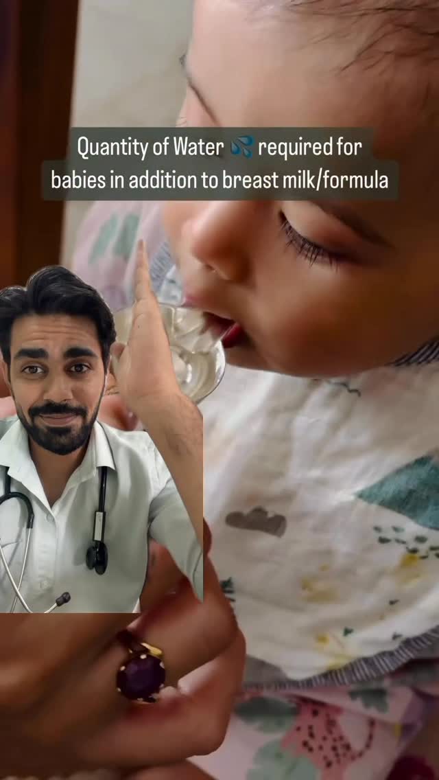 The amount of water required by babies 0-6 months -No water required 6-12 months -60-120 ml (30-40ml) after each solid meal 12-24 months - 120-450ml (100-120ml) after each meal #babycare #babywater #newmom #6months #7monthold