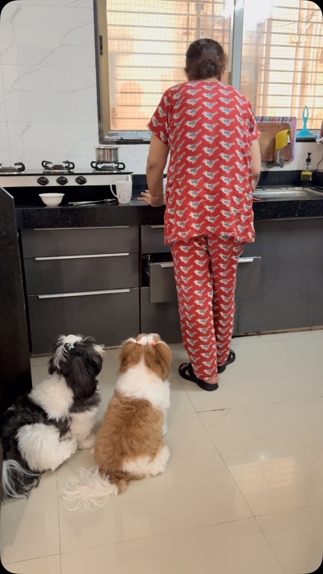 Behind every mom in the kitchen… are two tiny shadows with wagging tails and hungry eyes. 🐾💛 #KokoKoki #FurFamily #MomAndPups #KitchenBuddies #DogReel #PetLove