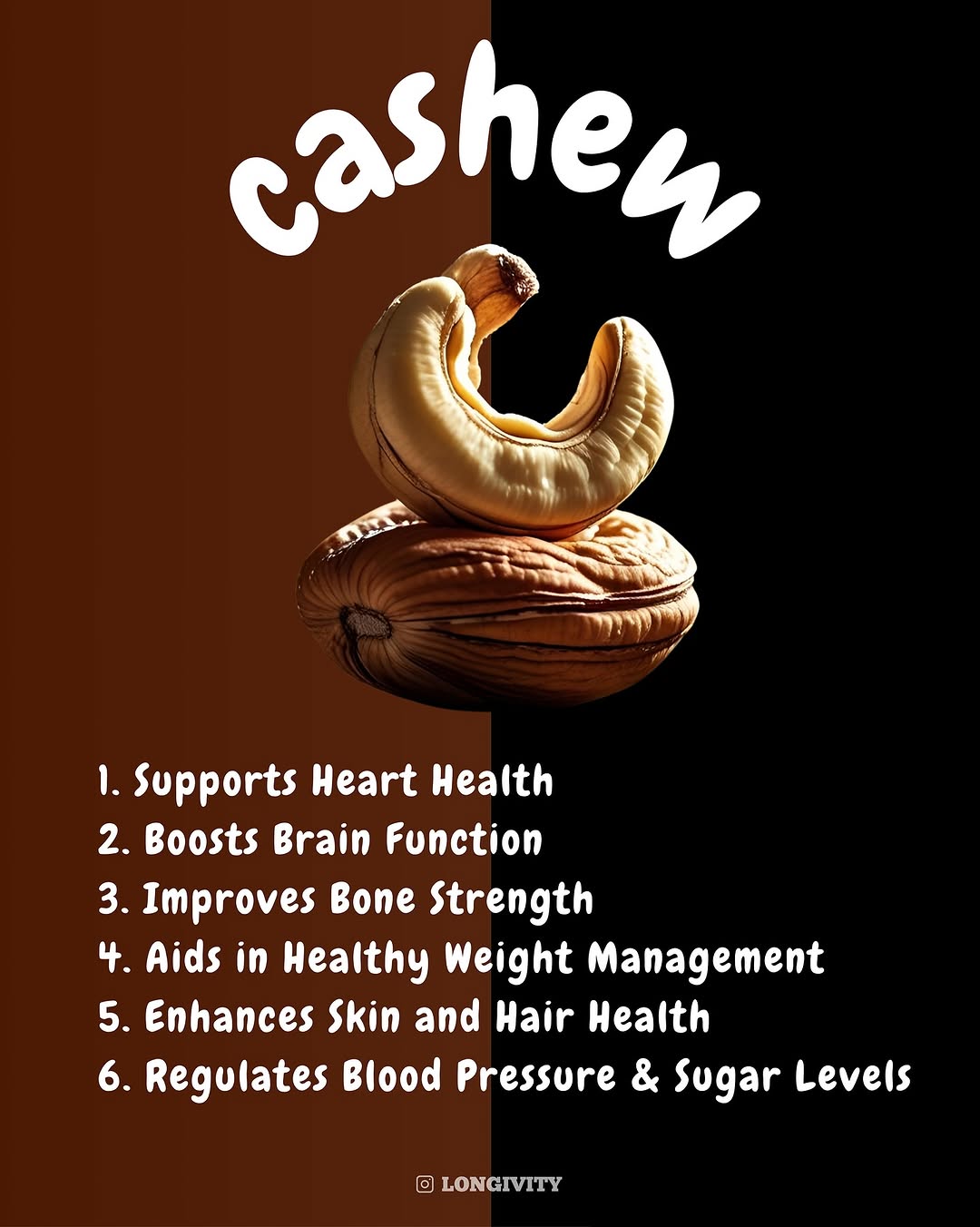 Small nut, big benefits! 🥜✨ Cashews are more than just creamy and delicious — they’re packed with nutrients your body loves: ✅ Boosts heart health ✅ Supports brain function ✅ Strengthens bones ✅ Rich in healthy fats & antioxidants ✅ Promotes glowing skin Add a handful to your day — your body (and taste buds) will thank you! #CashewPower #HealthySnacking #BrainFuel #HeartHealthy #PlantBasedProtein #LongevityLiving #NutrientRich #GlowFromWithin #SmartSnacking #wellnessfuel #longivity